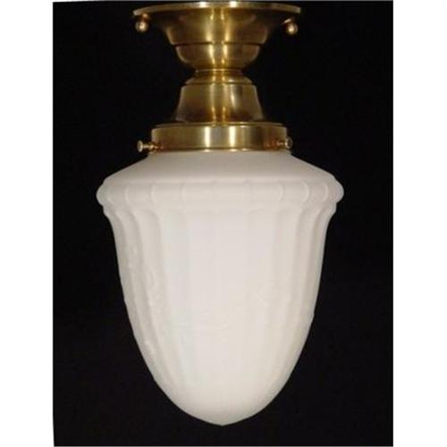 </font></strong>Flushmount brass fixture with pattern glass shade.</font>