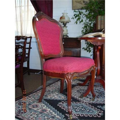 Rococo Victorian ladies chair with deep carvings of the rose and leaves along the top. Burgundy fabric is in good condition, but upholstery was done probably few years ago.