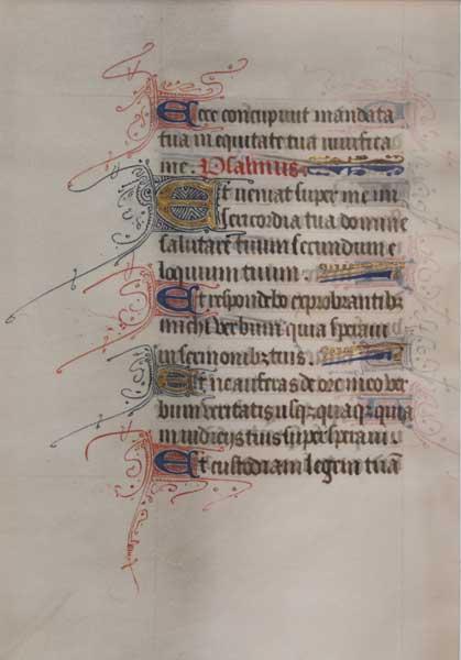 A leaf from the Book of Hours, a devotional book popular in the Middle Ages. It was developed for lay people who wished to incorporate elements of monasticism into their devotional life. In double sided frame