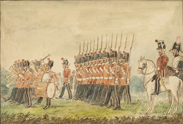 Framed original watercolour and ink drawing signed lower right 'Sadler'. Depicting members of the Dublin County Militia and band being inspected by their Colonel, William Brabazon. Appears to be part of a series of drawings one of which is held by the National Library of Ireland and attributed by them to William Sadler.