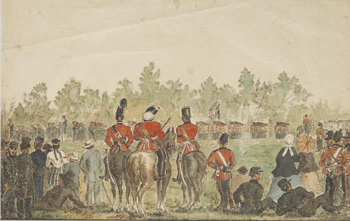 Framed original watercolour and ink drawing of the inspection of the Dublin City Militia (Queen's Own Royal Regiment) including Colonel Latouche, D. Leach and Adjutant Forsythe. Acquired from the same source as Lot 292 and in the same style as that artist.