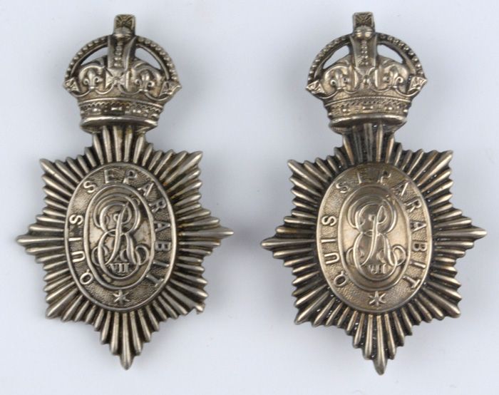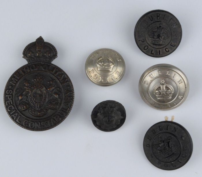A pair of scarce D.M.P. white metal die-stamped cap badges. In the form of an eight pointed star surrounding the motto 'Quis Separabit' with the EVII royal cypher and surmounted by a crown. Both complete with lugs north and south. Also with four mixed QC and KC D.M.P. buttons by J. Ireland and a Metropolitan Police Special Constabulary KC bronze lapel round badge. (7 items)