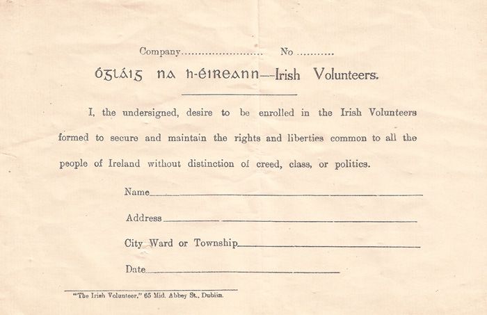 A scarce blank form designed and worded by Padraig Pearse. Produced by "The Irish Volunteer" 65 Mid Abbey Street, Dublin.