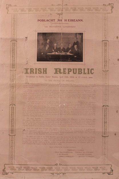 The words of the proclamation underneath an image of the signatories and within and green decorative border. Printed by City Printing Co. Limerick. Scarce with few other known examples.