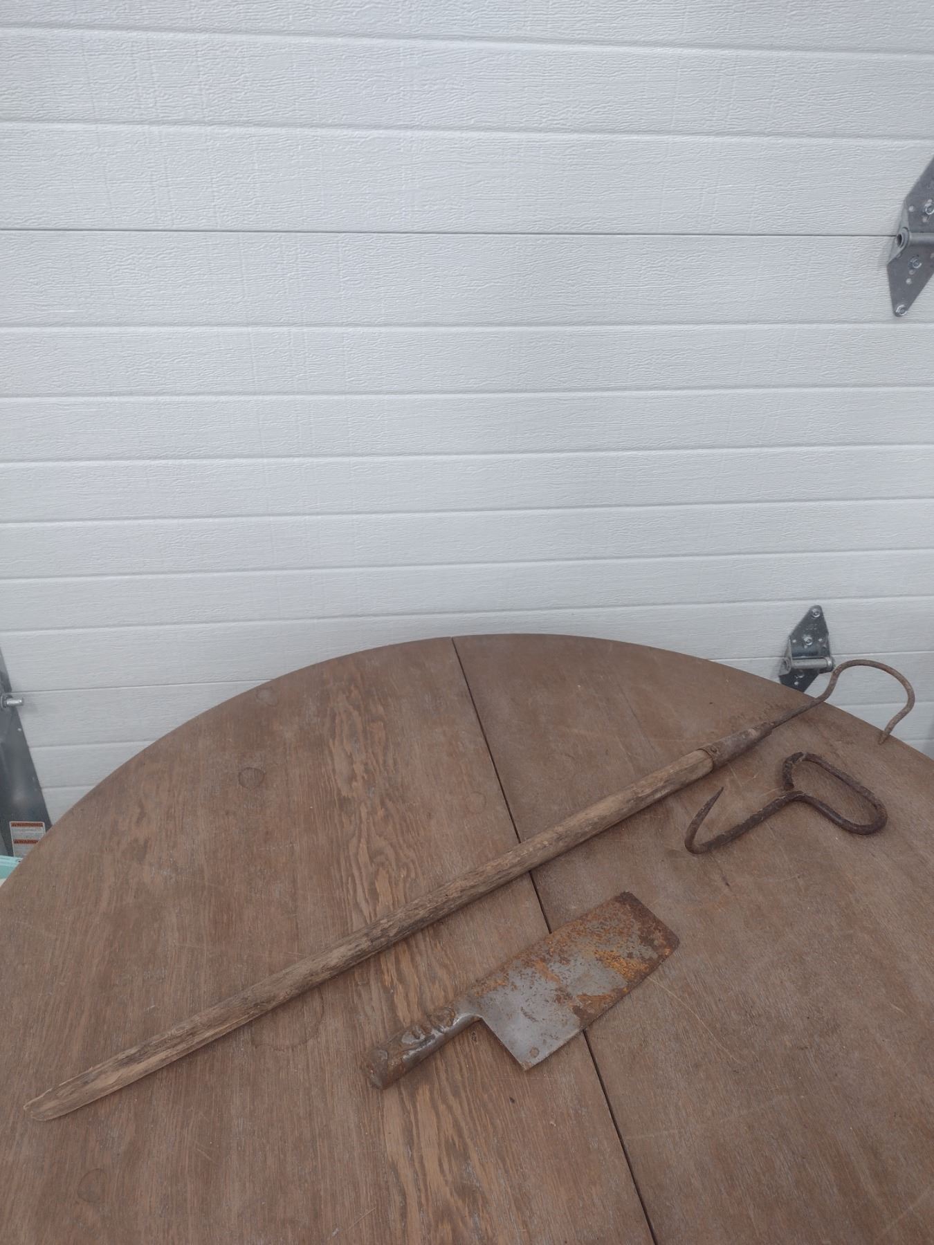 cleaver, bale hook and fish gaff