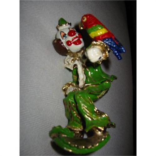 this exquisite and fun sculpture is made of a fine metal, assuming bronze. it is extremely heavy for the size. a clown is holding a parrot in his sitting style. although it is not signed, but it is apparent that this is Ron Lee's art work with magnificent hand paint and color mixed with gold. it measures 5 inches and in excellent condition normal wear and tear. something to think about.