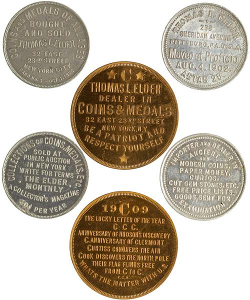 Three different Thomas Elder Advertizing Store Tokens: 1) 1902 obverse: importer and dealer in ancient and modern coins, paper money, curios, cut gem stones, etc. Free Price Lists, Goods sent for examination. Reverse: Thomas L. Elder 238 Sheridan Avenue Pittsburg, PA U.S.A. Legend: "Moveo et Proficio Aug 4 1902 Aetas 28." Aluminum, 30mm, uncirculated. 2) Obverse: 1906 Coins and Medals of All Ages bought and sold Thomas Elder 32 East 23rd Street New York City, card No. 3, Oct. 1 1906. 30mm, Delorey #4, aluminum, uncirculated. 3) 1909 obverse: Large C with stars each side Thomas L. Elder dealer in Coins and Medals 32 East 23rd Street New York, NY "Be a Patriot and Respect Yourself" star below. Reverse dated 1909. Legend: "The Lucky Letter of the year CCC Anniversary of Hudson's Discovery, C anniversary of Clermont Curtiss conquers the Air, Cook discovers the North Pole their Flag Flings Free from C to C," small initials F.C.N. "Whats the matter with US." Delorey #14, five struck, 38mm, copper, uncirculated.