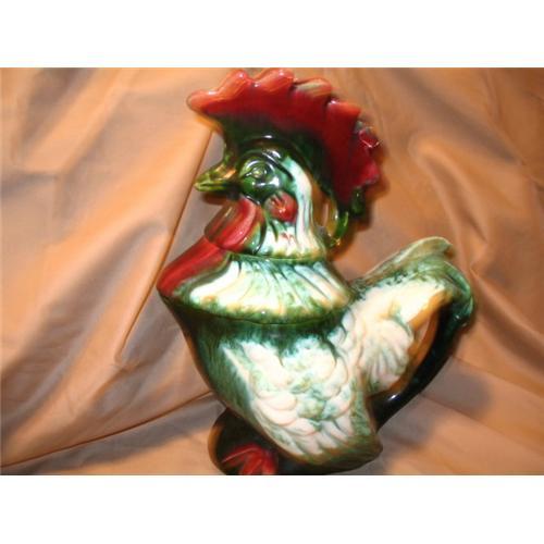 Unique and cute this rooster has his red comb(crown) act as a place to put cream so it will stay warm, underneath is a section for sugar and then the main tea/coffe pot. All three pieces in great condition. The bottom is signed Alexa Calif with a flower etched into the pottery. This is a really rare find and worth every penny.