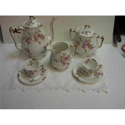 a beautifull set of 6 cups and saucers , a coffee pot , sugar pot and milk pitcher . Limoges 19 century , decor on both side , very pretty in the pink and green . mint condition . ready to use .