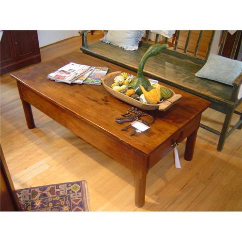 Four nice cherry boards make the top of this French coffee table. It has a thick apron and one large drawer in the end.