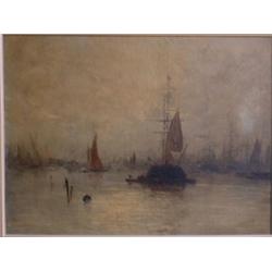 École anglaise 19e S./19th C. English School. "Fishing Boats in the Harbour at Sunset". Huile sur toile, signée. Oil on canvas, signed. 19 1/4" x 26" - 48.8cm x 66cm. $800/1200