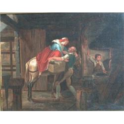 École belge 19e S./19th C. Belgian School. "An Amorous meeting in the Blacksmith's Shop". Huile sur toile. Oil on canvas. 12 1/2" x 15 1/2" - 31.6cm x 39.2cm. $2000/2500