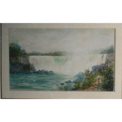 École canadienne 19e S./19th C. Canadian School. "Lady with a Parasol near the Horseshoe Falls, Niagara". Aquarelle. Watercolour. 4 3/4" x 7 1/2" - 12cm x 19cm. $350/550