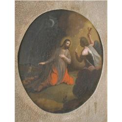 École espagnole 18e S./18th C. Spanish School. "Jesus in the Garden of Gethsemane". Huile sur panneau. Oil on board. 11 1/2" x 13 1/2" - 29.2cm x 34.2cm. $1000/1500
