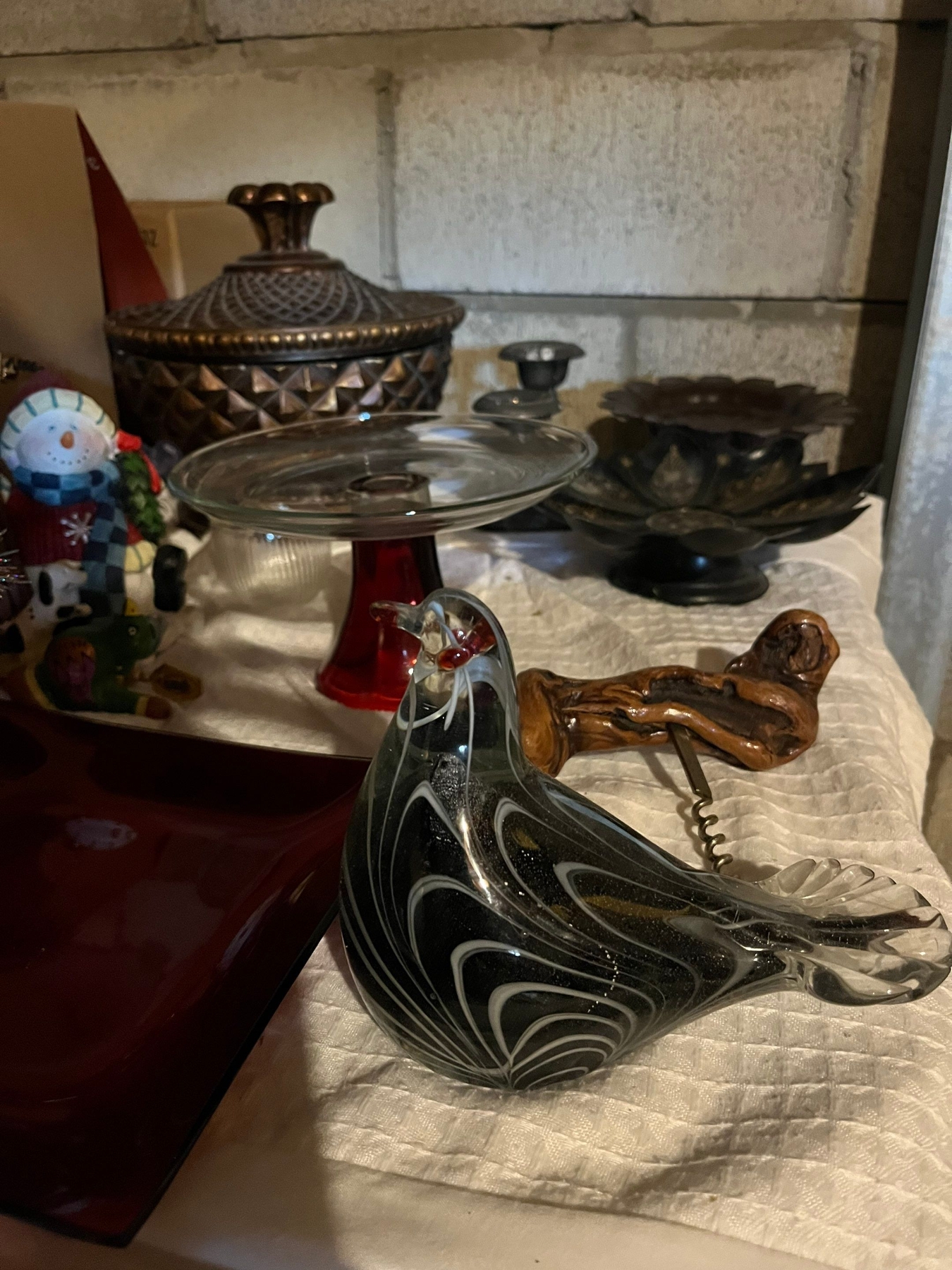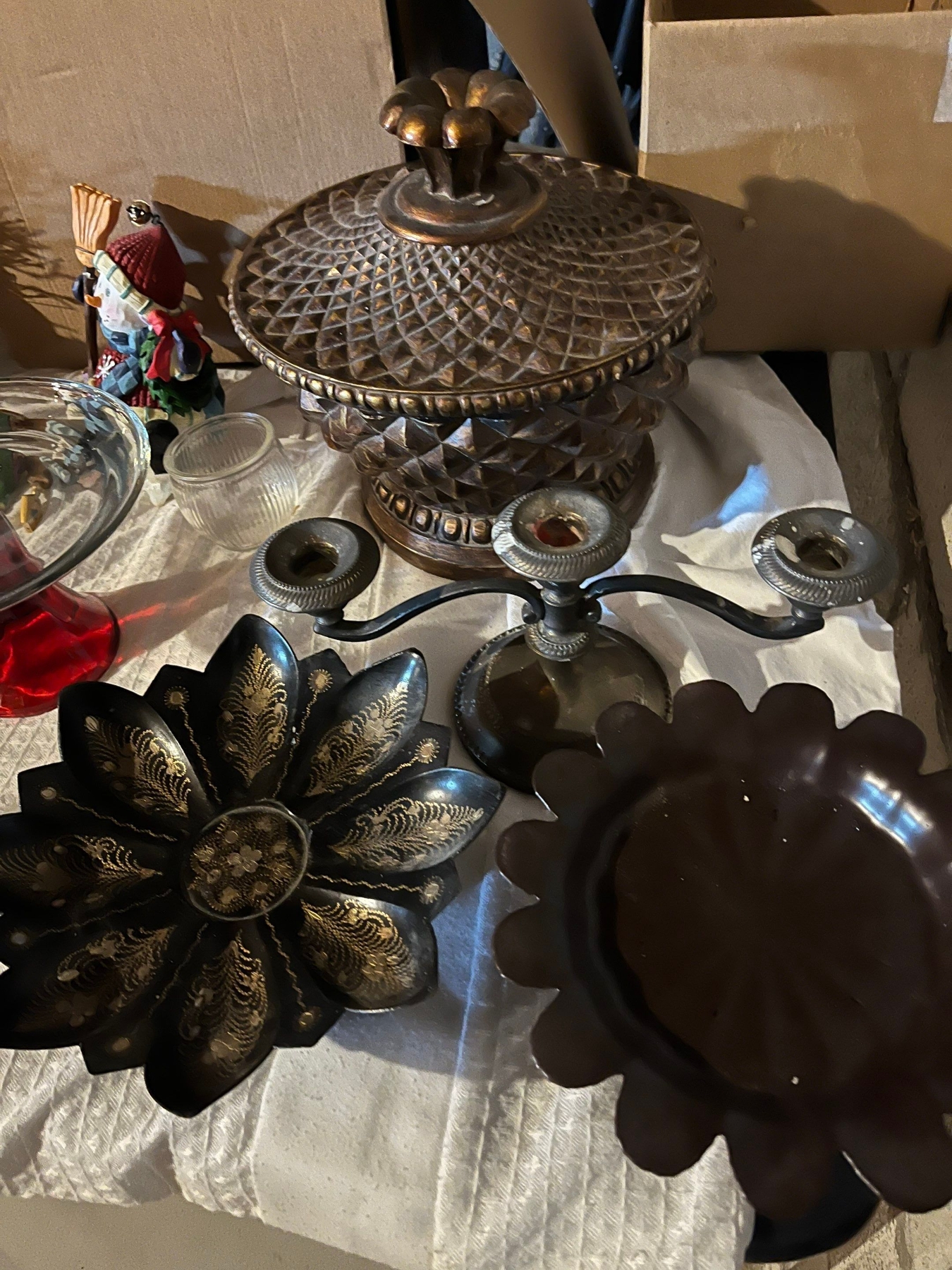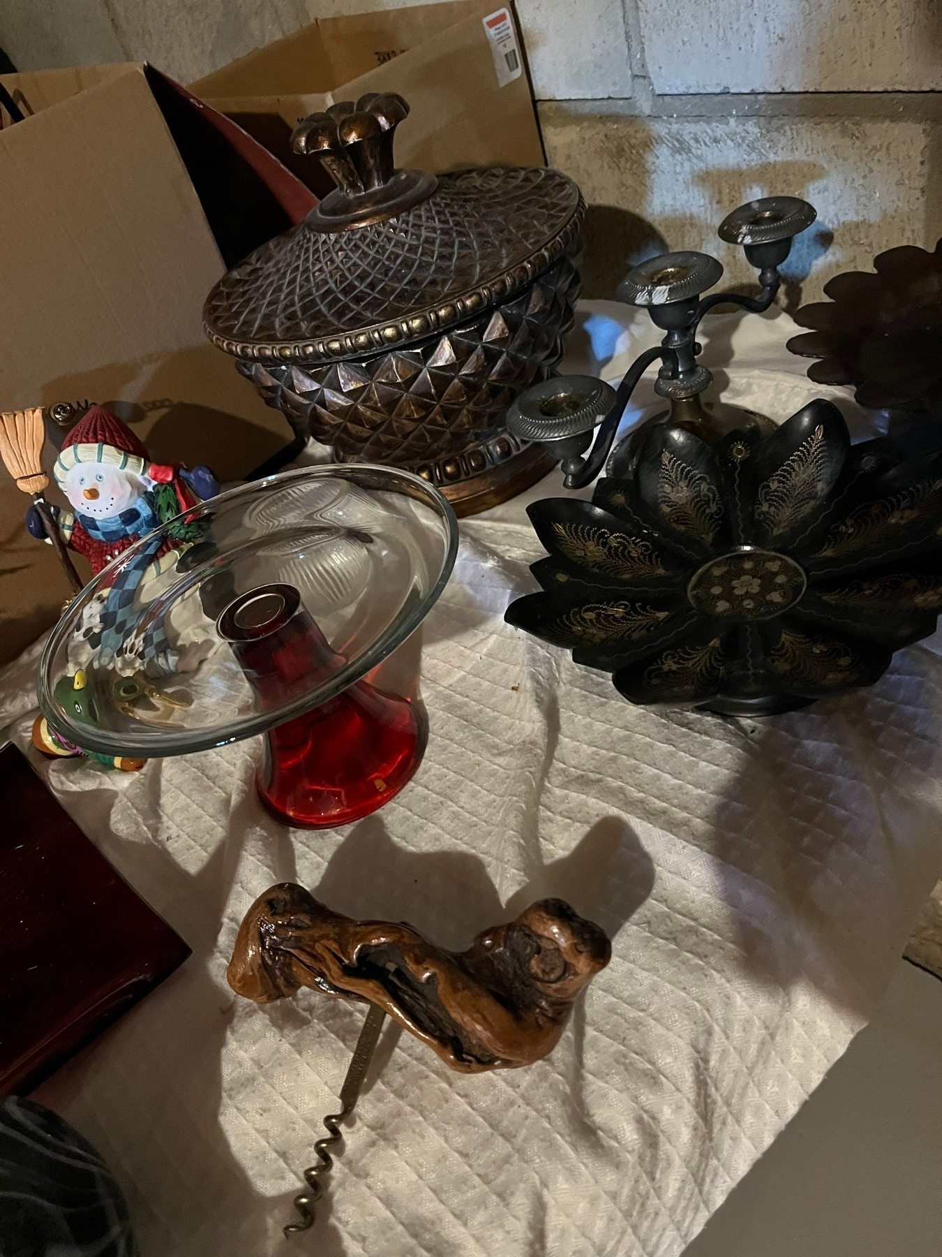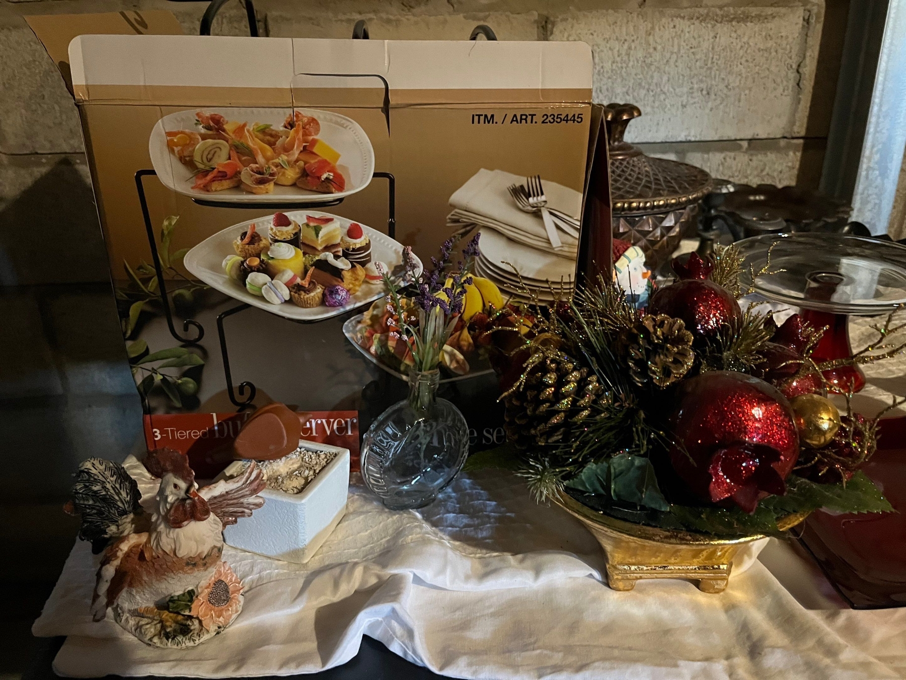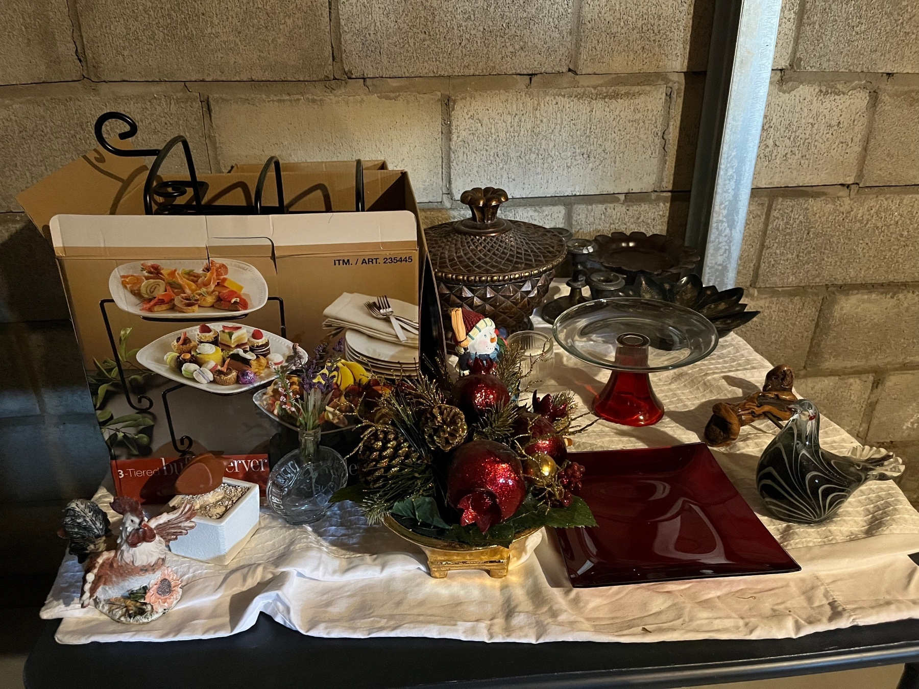 collection of Christmas decorations, serving plates and a vintage ice bucket
