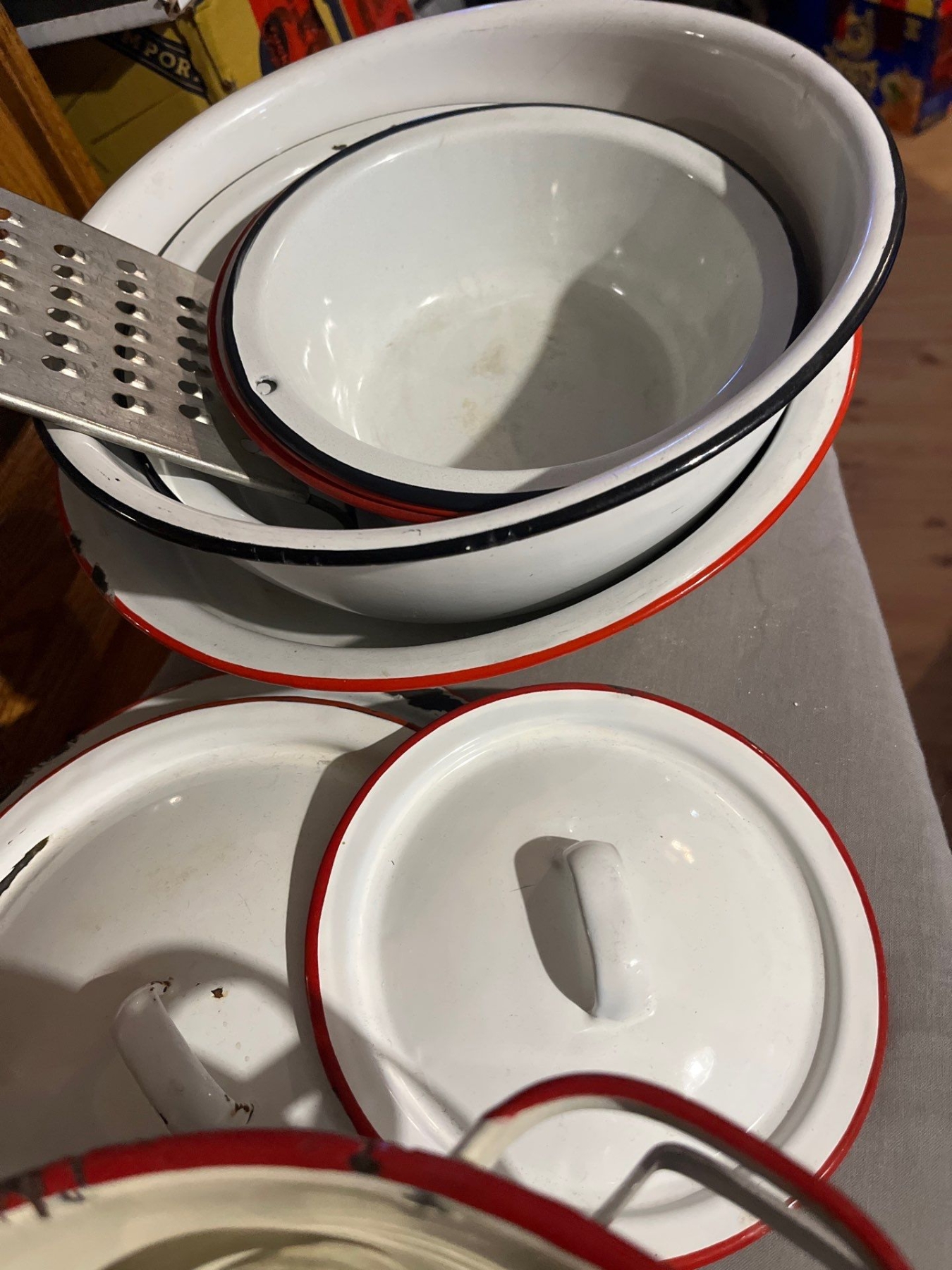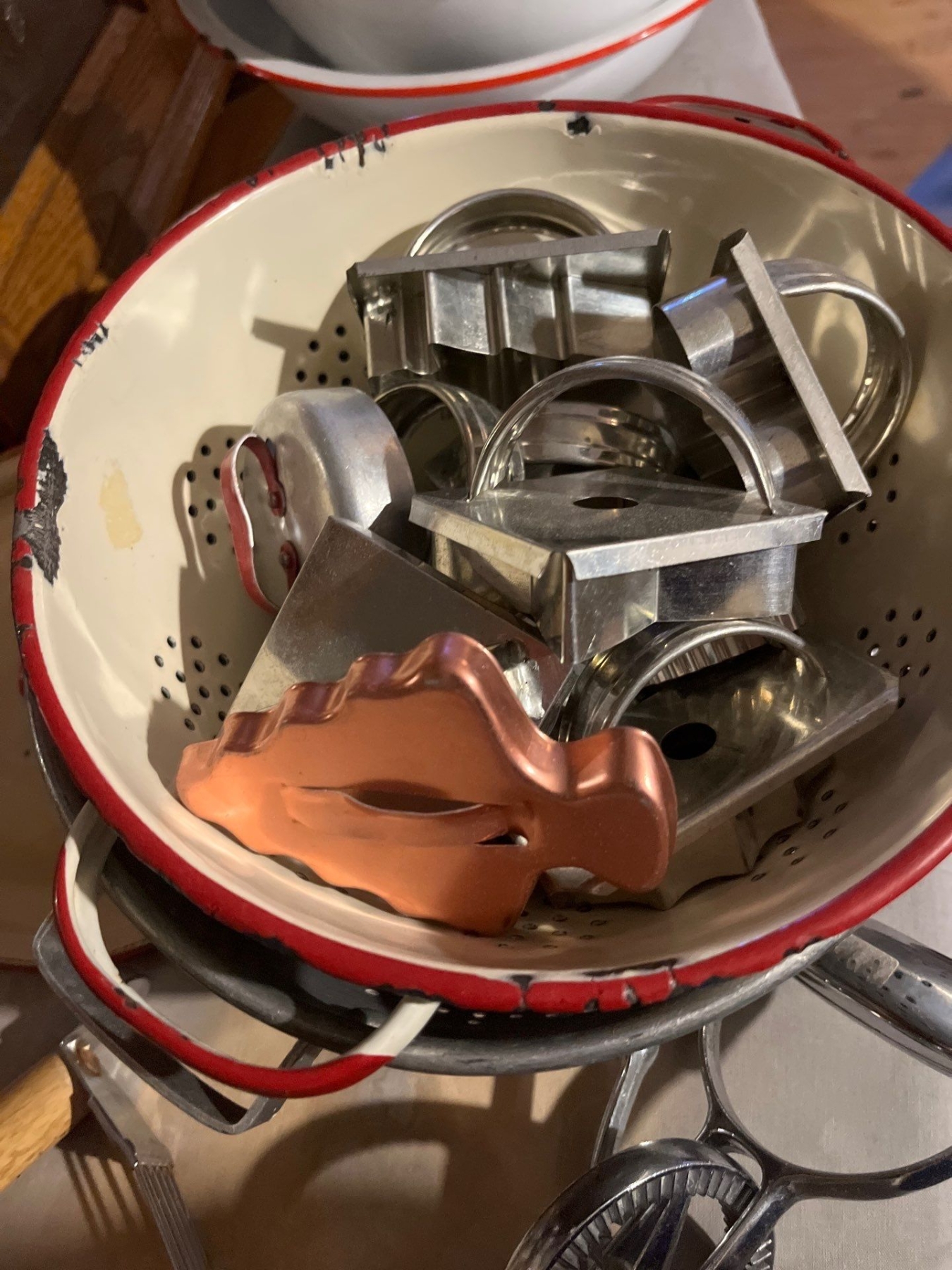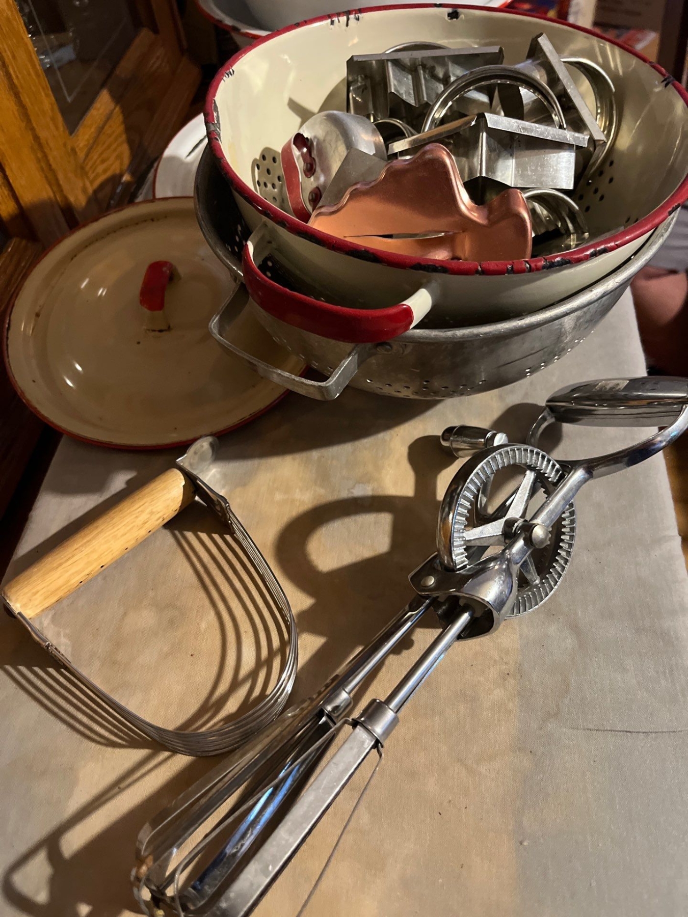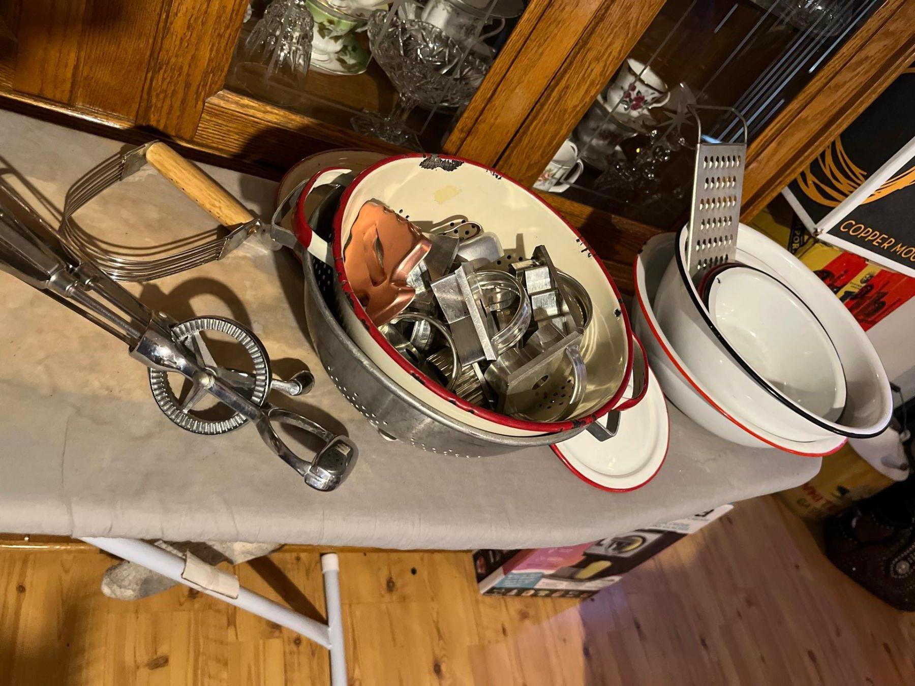 collection of enamel pots bowls with a collection of lids, vintage strainer, and vintage cookie cutters with hand twist egg beater .