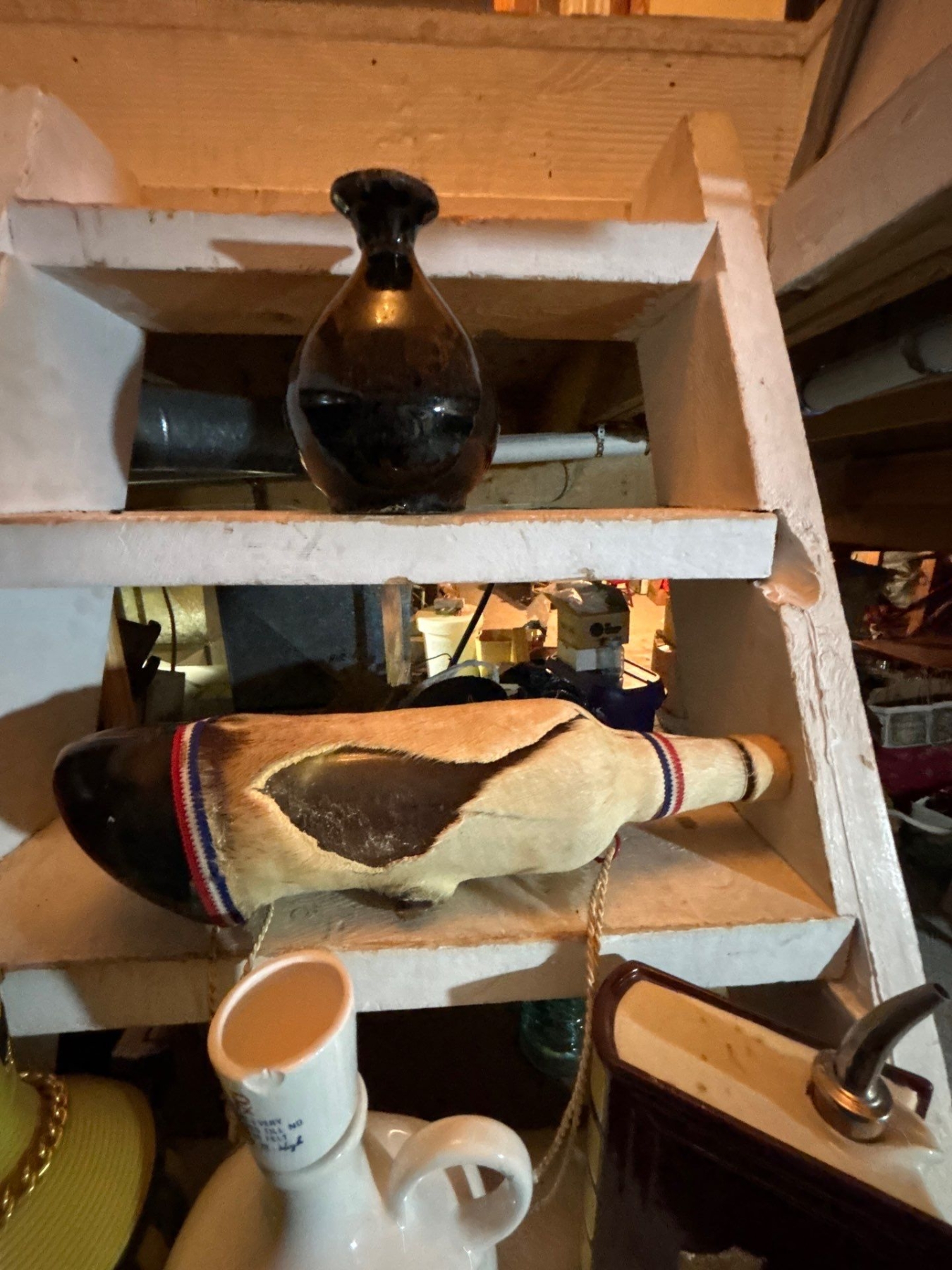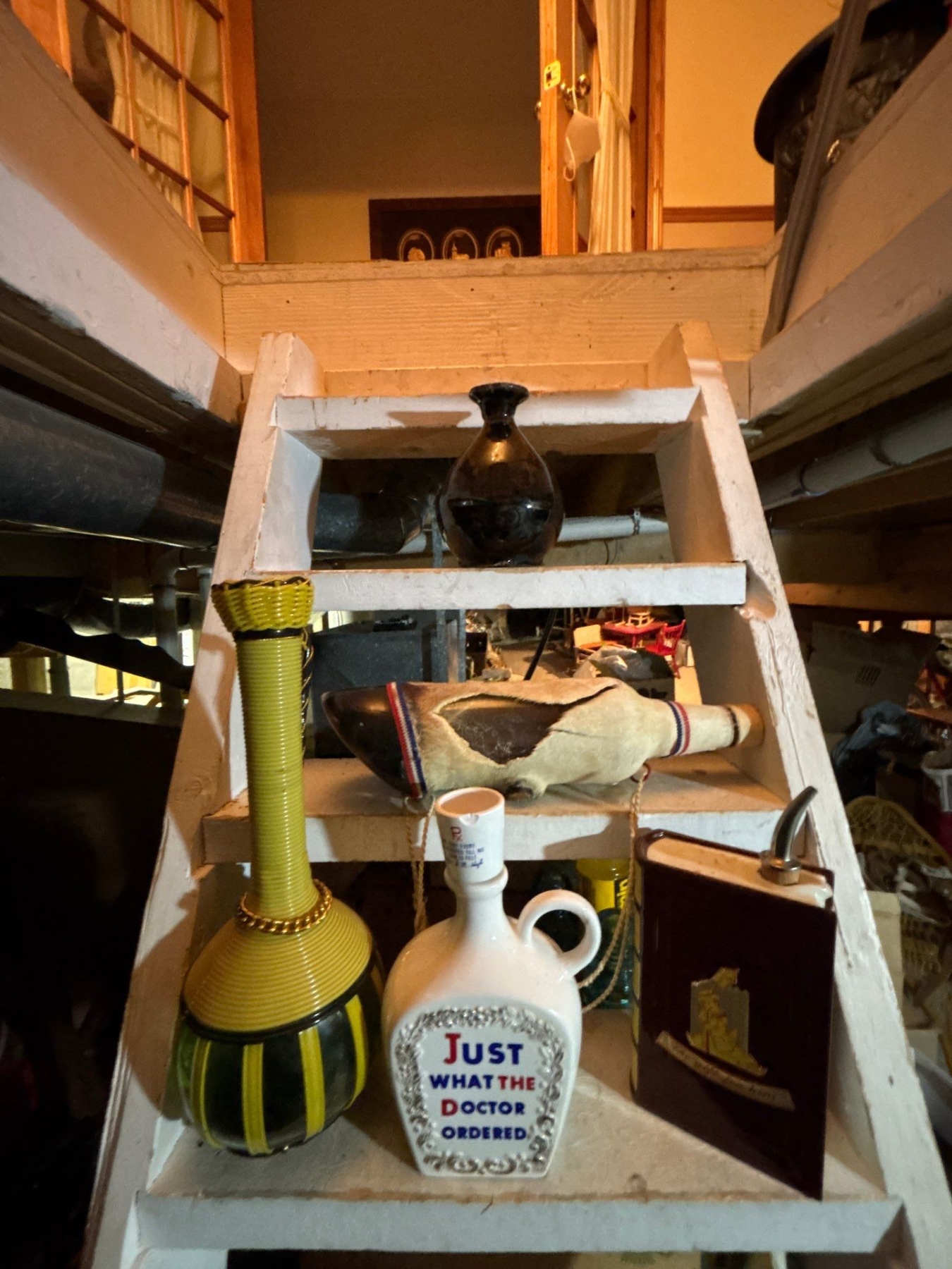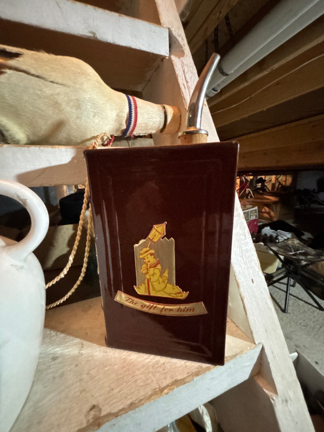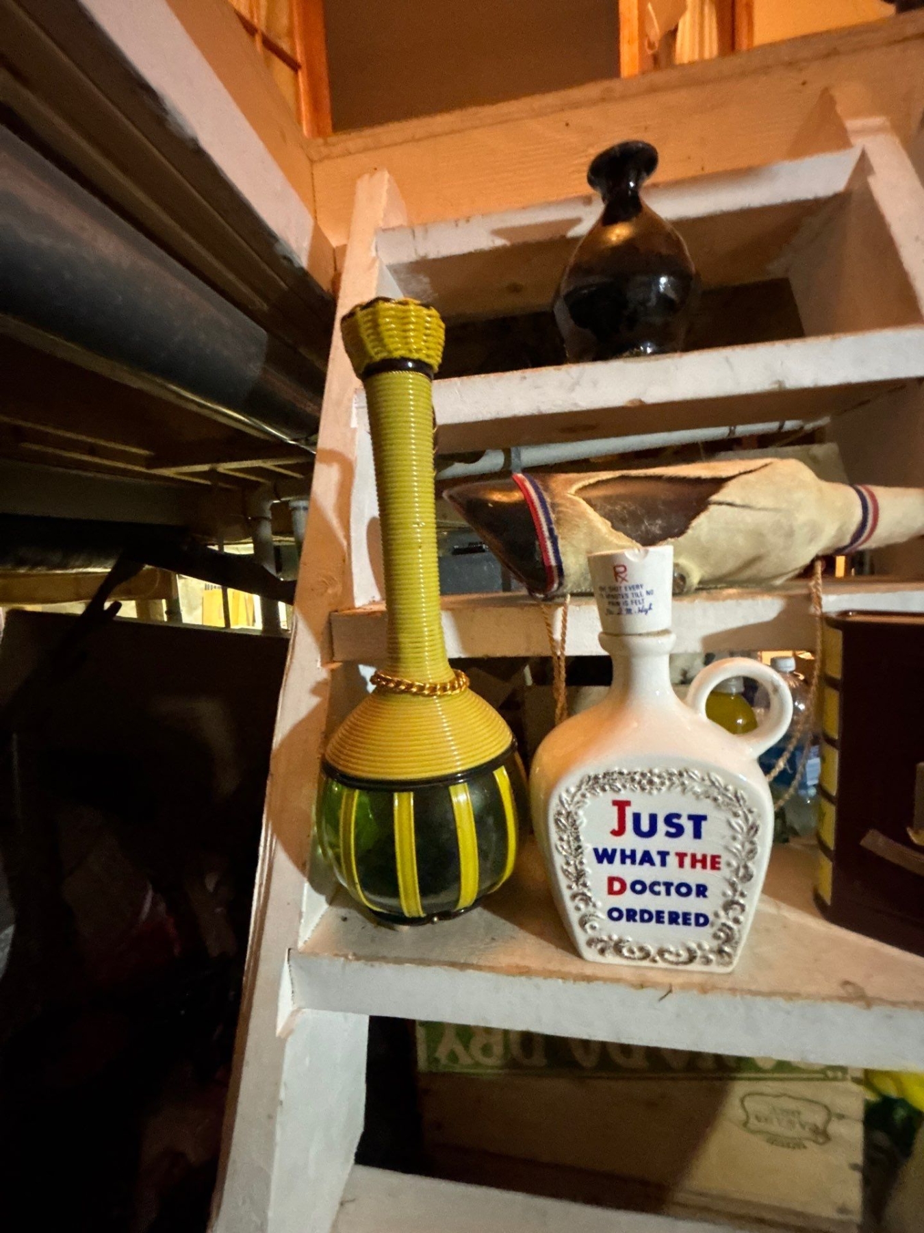 collection of four oddity liquor bottles just what the doctor ordered has a slight chip on the cork 1930 style small brown vase