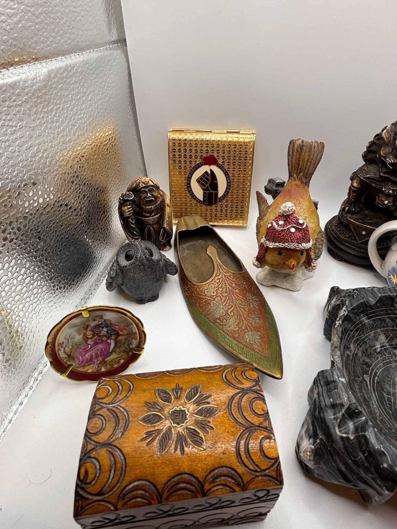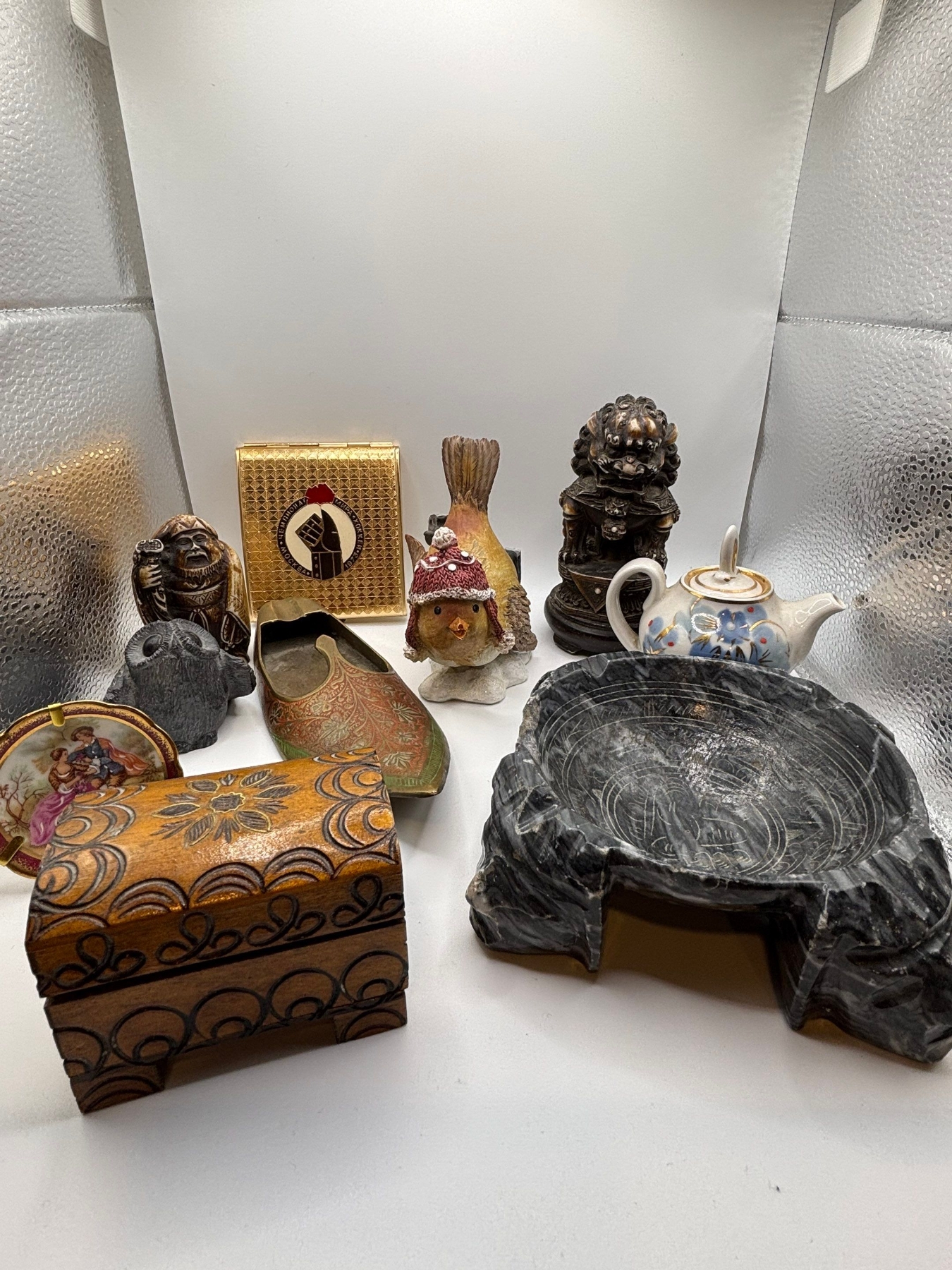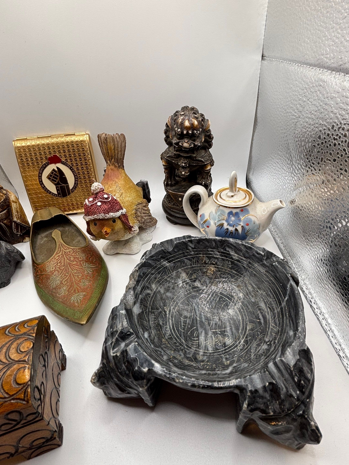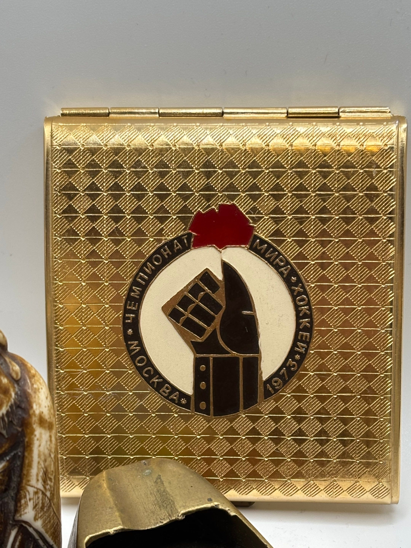 collection of items from around the world, including small, teapot, copper boot, small wooden handmade jewelry box. And collectors cigarette case from the 1973 Ice Hockey World Championship held in Moscow. N26