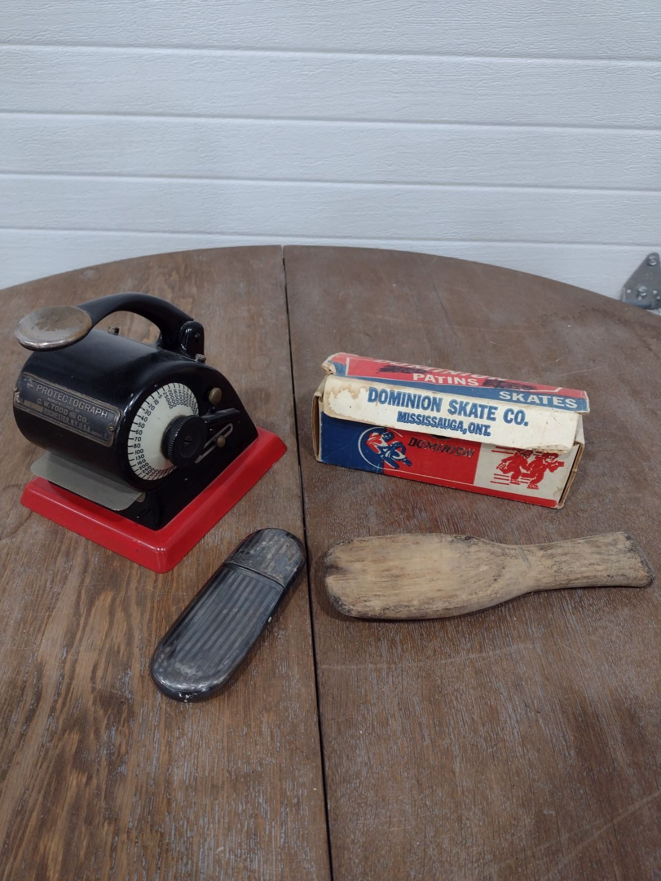 flask, mini skates, butter ladle, protectagraph check stamping machine