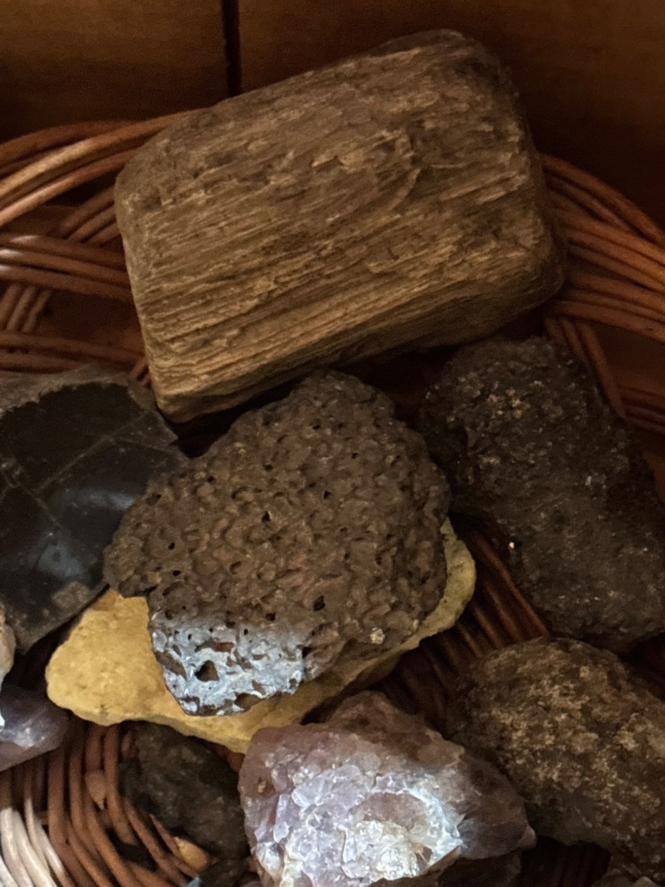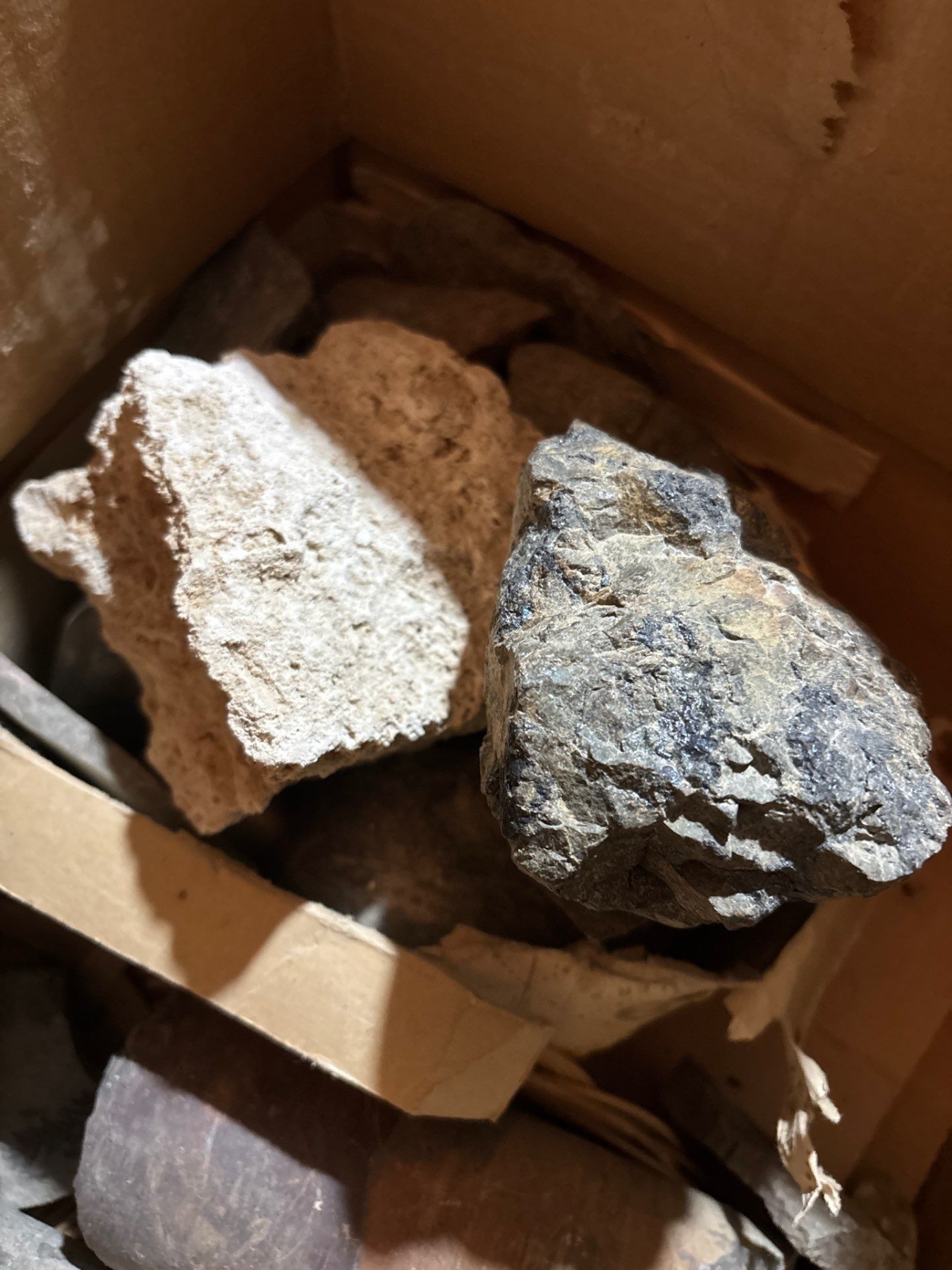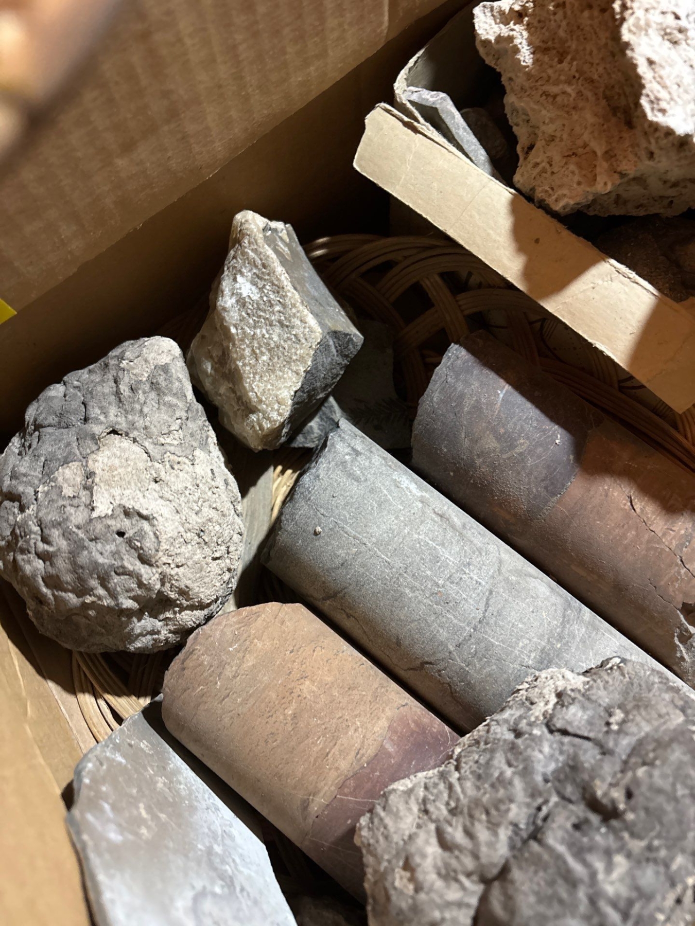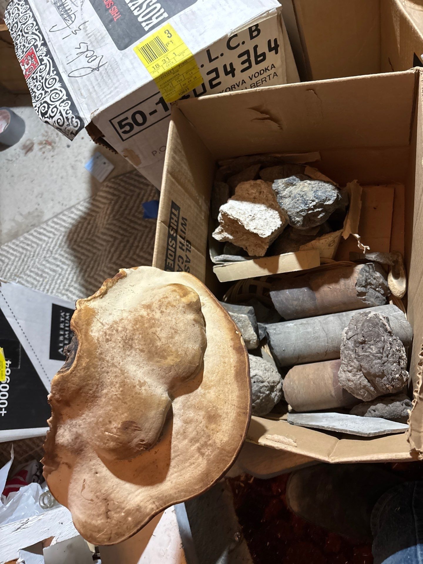 collection of miscellaneous rocks, core samples, and Red-belted conk (Fomitopsis pinicola), a common type of bracket fungus also known as the red-belted bracket.