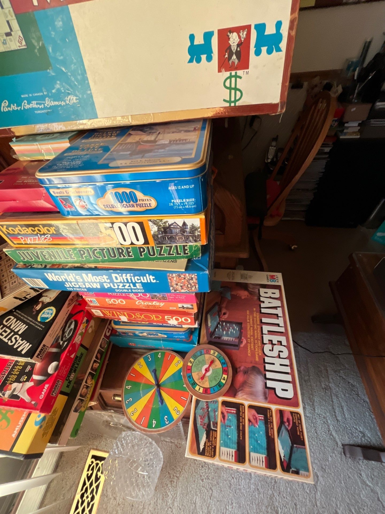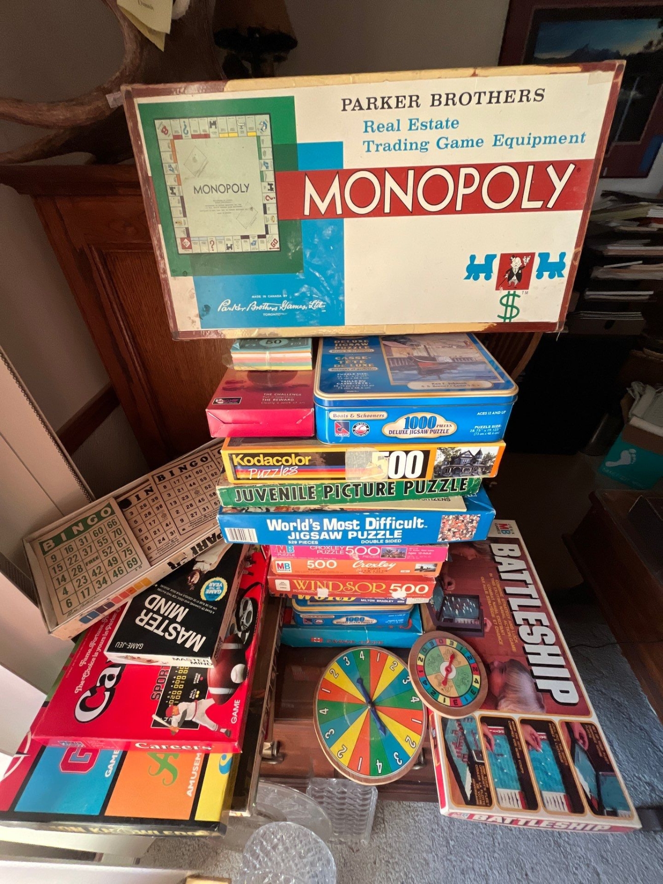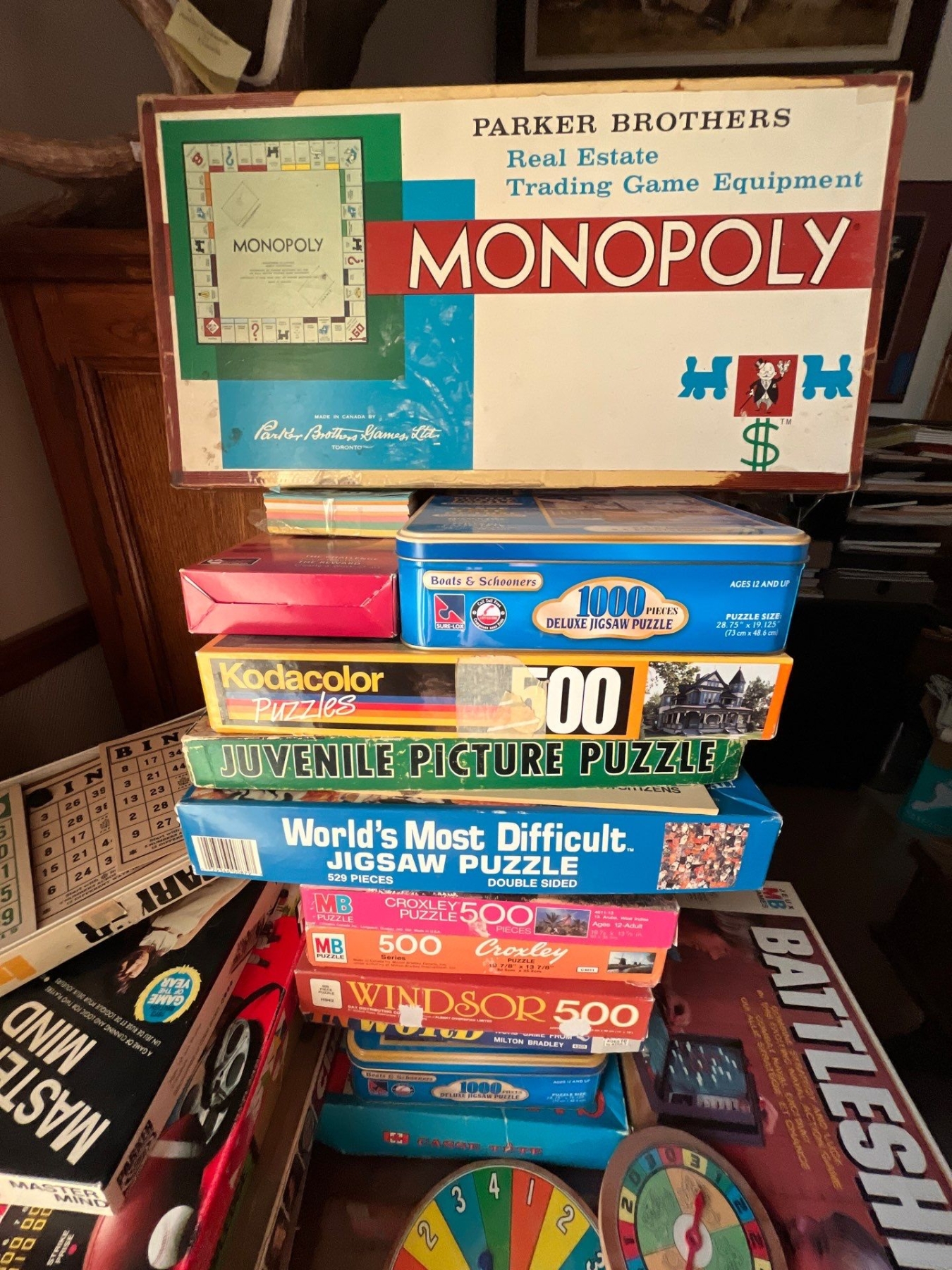 collection of puzzles and vintage games monopoly, battleship, bingo mastermind, common knowledge, clue, and payday