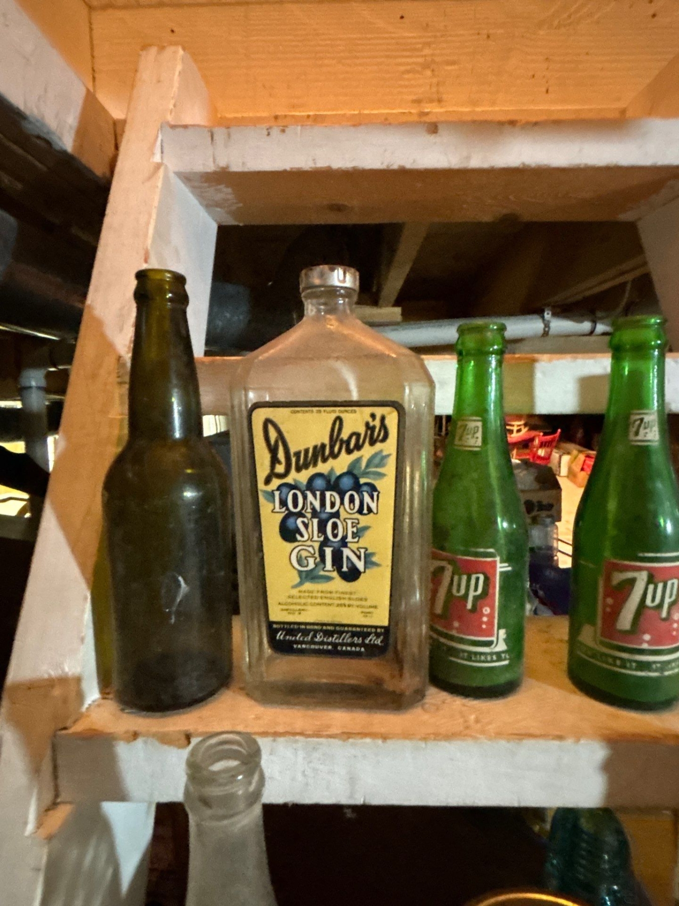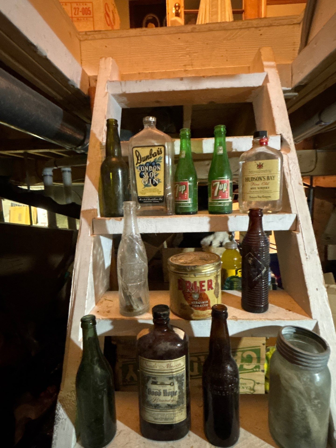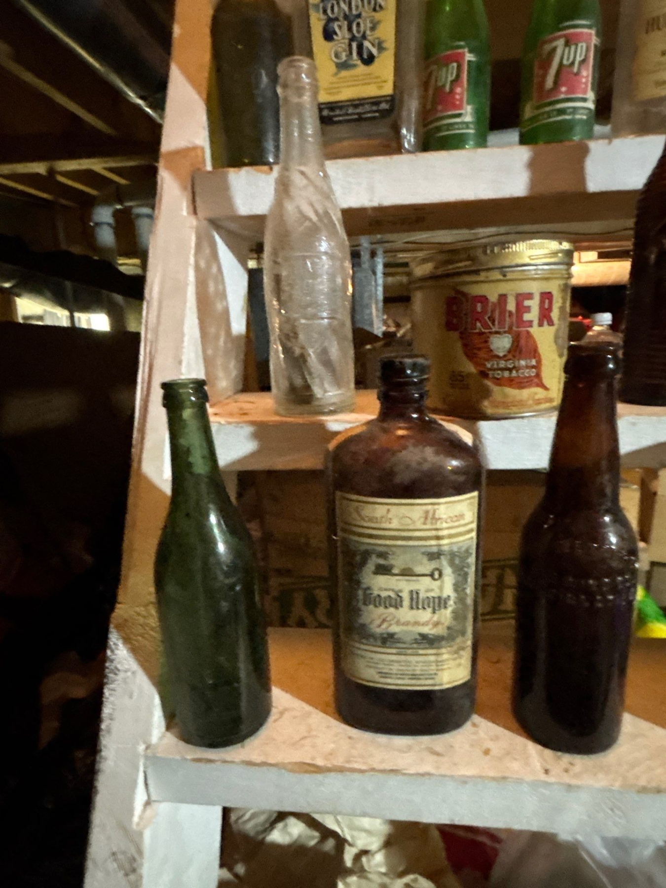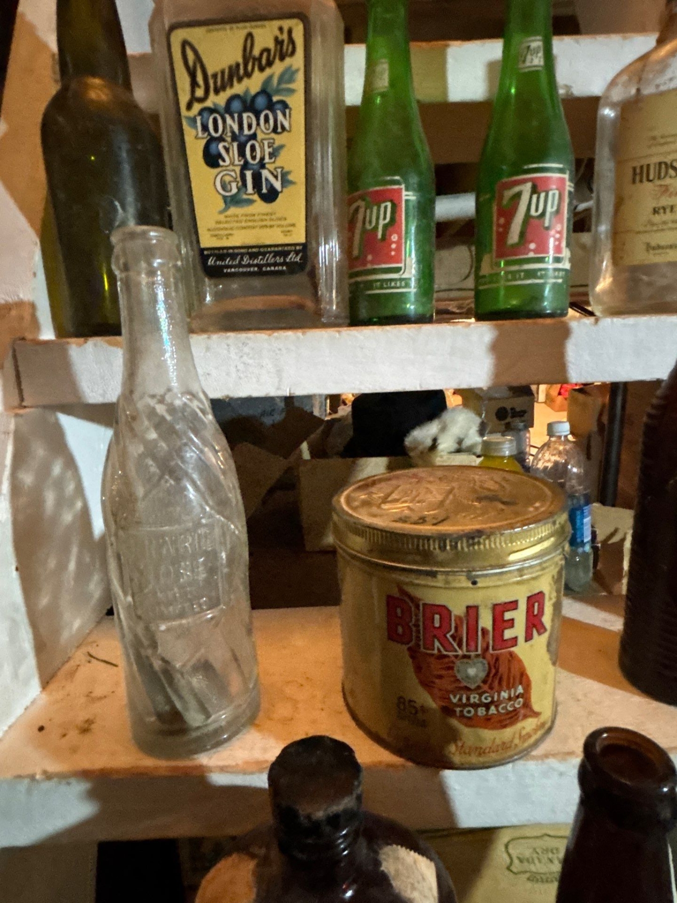 collection of vintage bottles straight from the dirt to the box free dirt included, Hudson's Bay fine old, rye, whiskey, 7-Up, South African good hope brandy Dunbars, London, slow gin, orange crush bottle with faint label and briar Virginia tobacco can