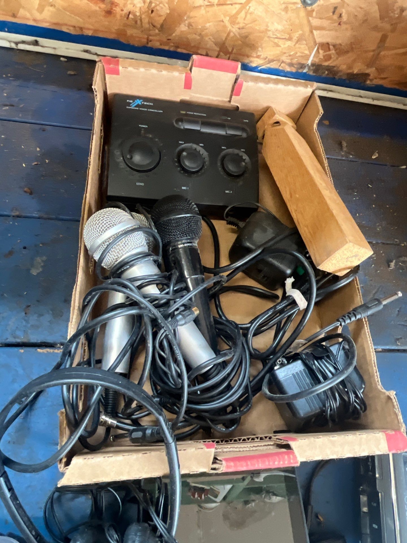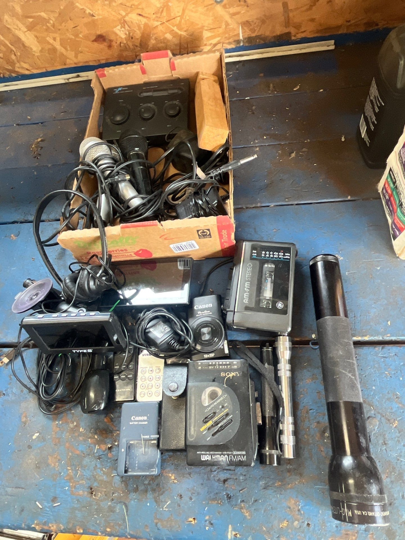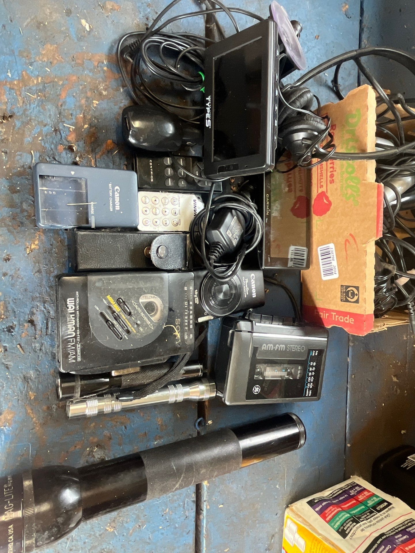 collection of vintage digital cameras, Walkman microphones magnets of all sizes and GPS units