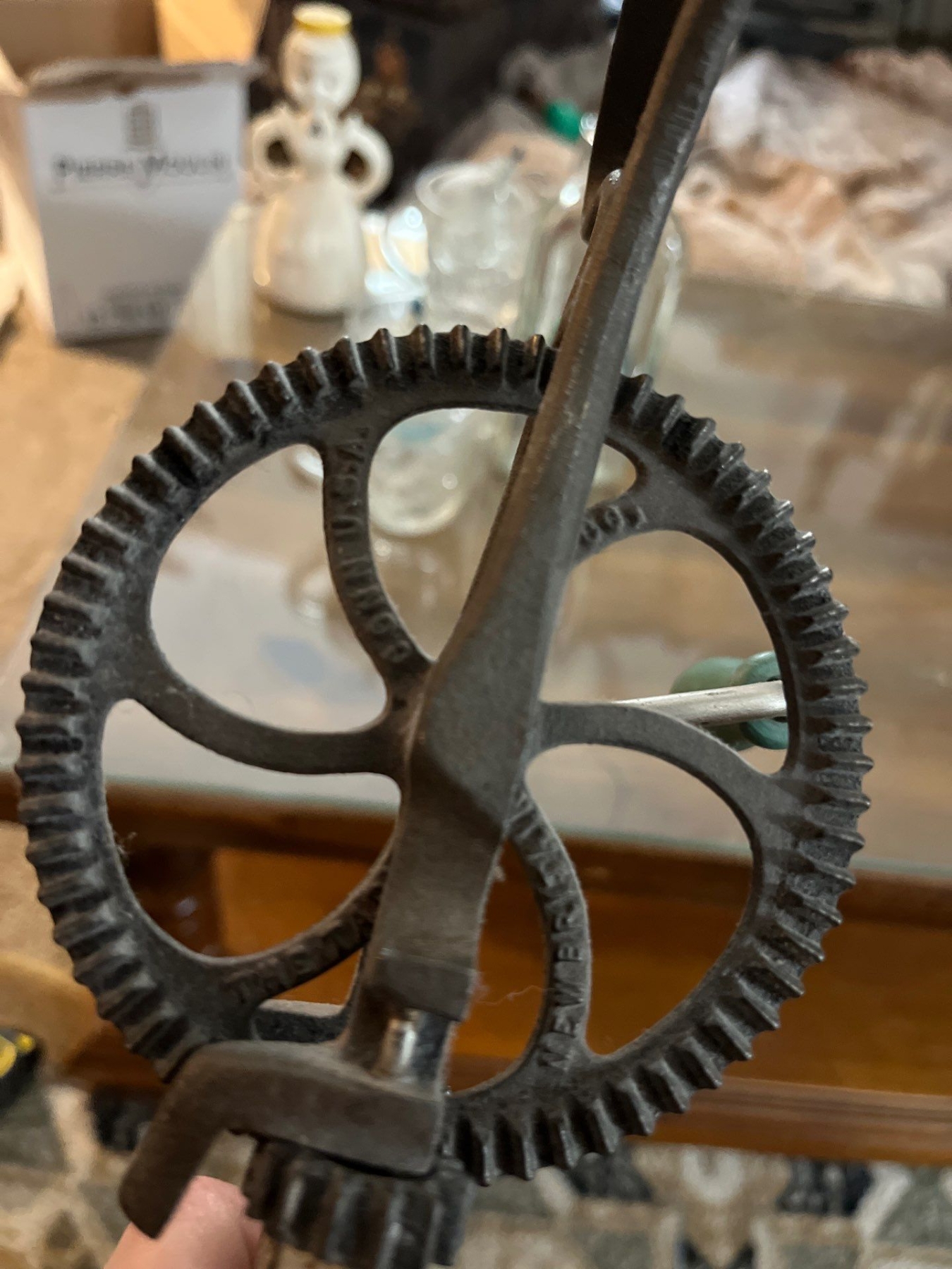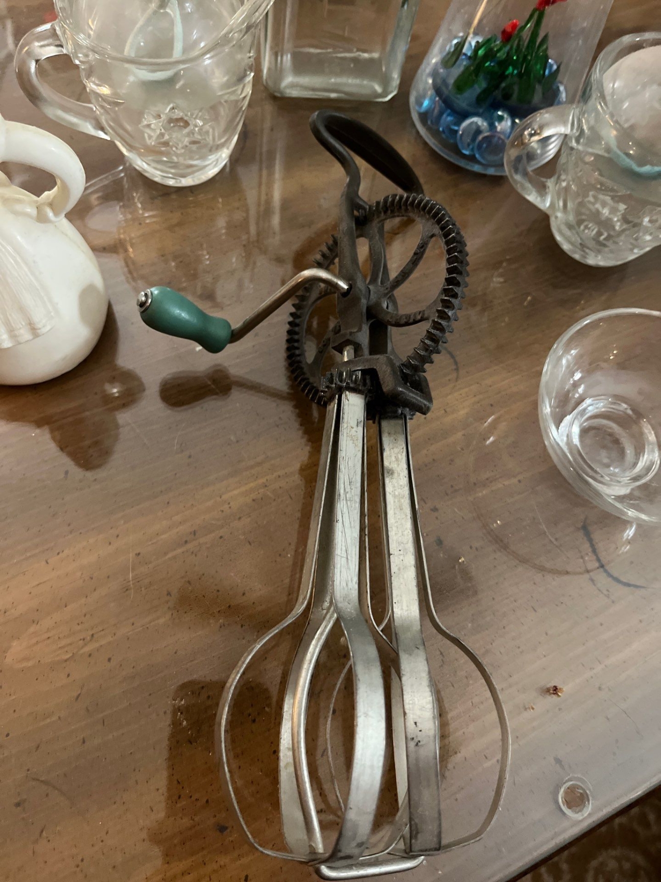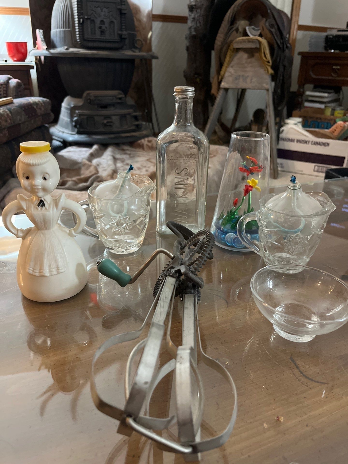 collection of vintage glass, storage containers, and bottles, Watkins and other notable names along with a double duck planters pot. And two resume hand crank egg beaters in working condition.
