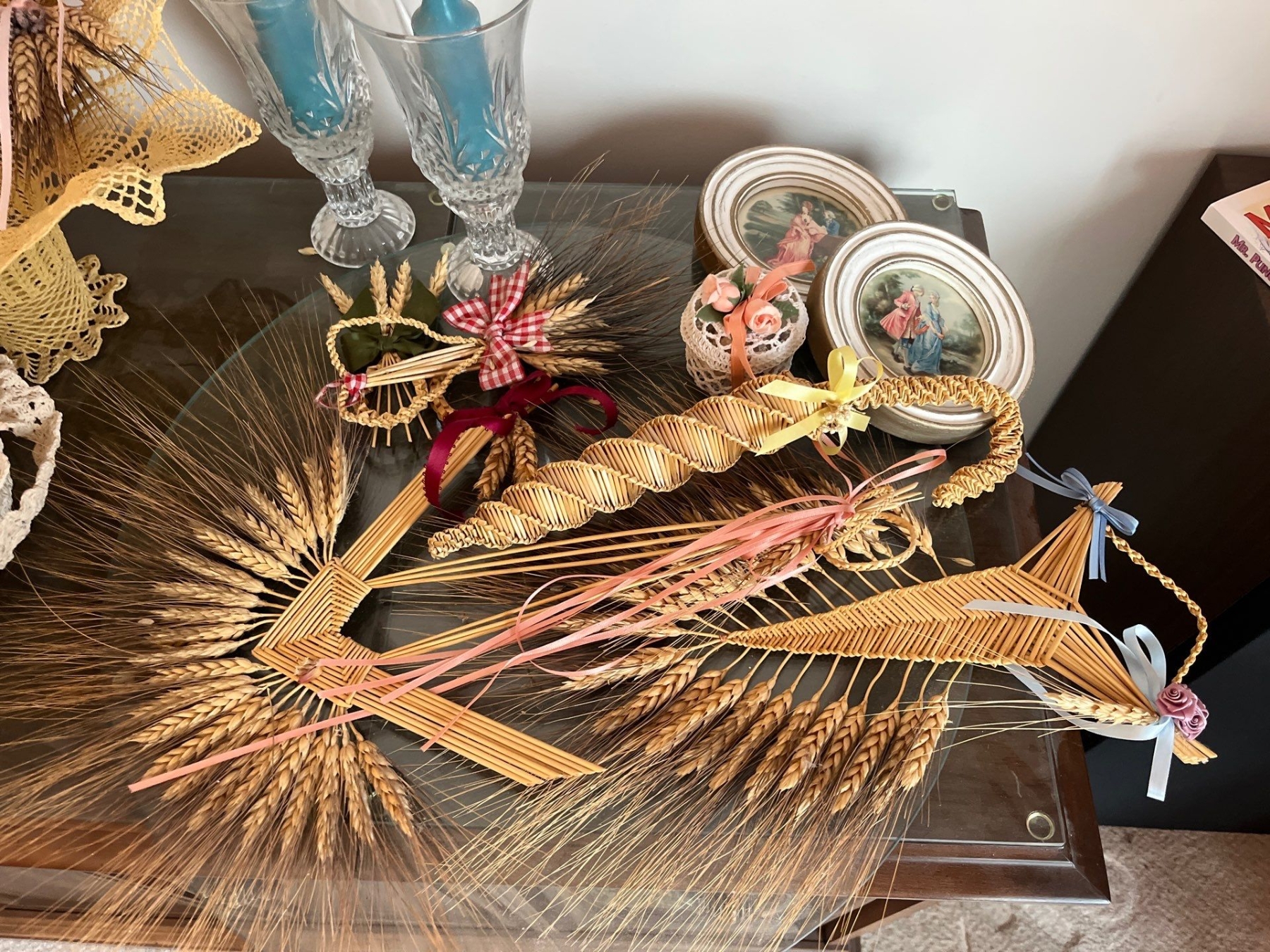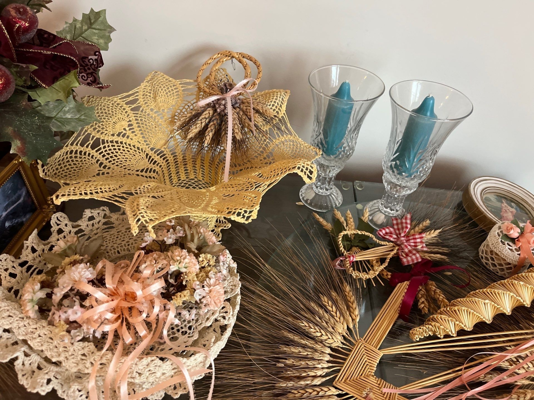 collection of weave baskets, wheat, art, candleholders, and two small framed picture