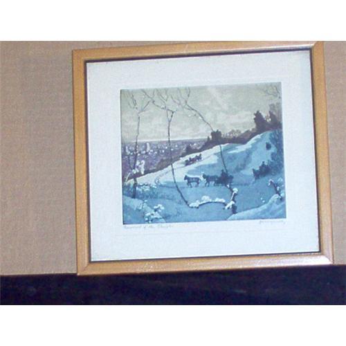 Hornyansky died in 1965 and is a much collected Canadian artist. This color aquatint is in fine condition and in its original estate found mat and frame. His winter scenes are considered particularly desirable and seldom found. Photo later