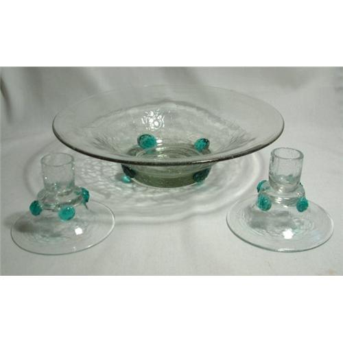 Crackle Glass Rossette Bowl and Rossette Candlesticks - both made by the Blenko Glass Company, ca. 1940's. Both these pieces are extremely rare. They are both in perfect condition. the rossettes are a turquoise in color. The bowl measures 11 1/2" across and 3" high. The candlesticks are 3 1/2" tall. (if anyone is interested in just the bowl or just the set of candlesticks, let me know , and a price will be supplied) All pieces are hand blown.