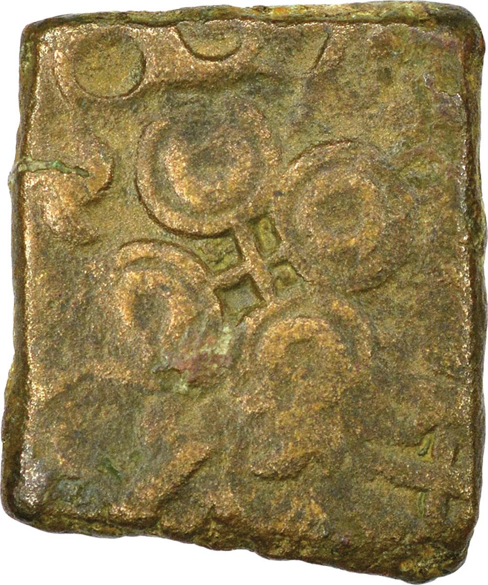 railing infront,Rev:ujjaini symbol, brahmi legends round the clock, 5.40g, 19.27 X 16.03mm, about very fine.
