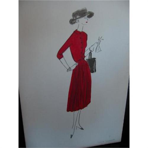 set of 4 design sketch from this really talented artist or student Jeanne Dueneck. these sketches are all signed either on the back or front on the cardboard. one of them is drawing of a lady with a yellow hair and green dress. the second one is a lady with a purple hat,brown hair wearing a purple/lavander dress with a patterned colors over coat (a sample of the fabrics are glued on the board. the third one is a lady with a grey black hat, black hair, and a nice black dressy handbag along with one glove on one hand wearing a red button dress. the last one is a lady with brown / red hair, wearing a patterned dress and a solid blue/green pant pointing with one hand and her other hand is in her pocket. reads on the back of one sketch: "crescent illustration board 100% rag . cold press surface No.110 Heavyweight and a product of Chicago Cardboard company". she appears to be a design student in Chicago or may be a famous desinger by now who knows. the sketches are not framed, and it can be framed of choice. they are very decorative and nicely done. they are measured, 15 inches tall and 10 inches wide. min. depth. very collectible.