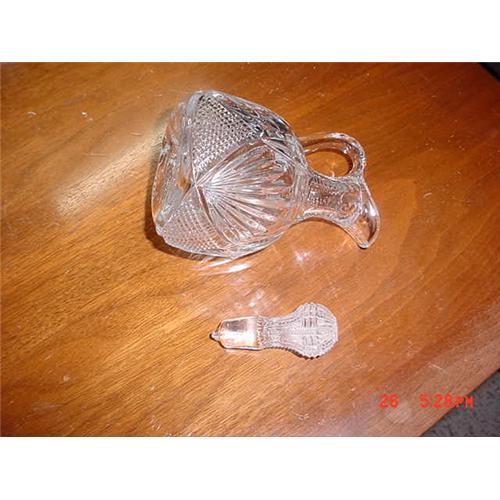 This is an early American prescut handblown glass cruet (see pontil mark on bottom). The design includes a pineapple design. The stopper appears to not fit snugly and does not appear to be the original stopper. However, it does match. There is a 1/4" rough spot on the glass underneath the bottom edge.