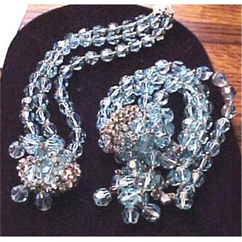 They are made of 4mm aqua crystal glass beads strung with silver spacers. The ornate center is a decorated half circle covered in prong set rhinestones of the Haskell quality. There are dangle dead strand that flow from the center like a waterfall.