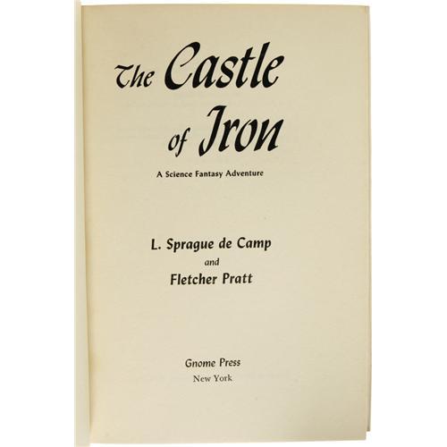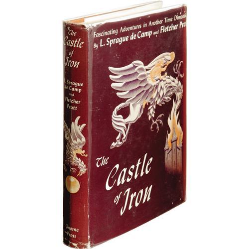 <B>L. Sprague de Camp and Fletcher Pratt: <I>The Castle of Iron</B></I>.</B></I> (New York: Gnome Press, 1950), first edition, 224 pages, orange cloth with brown lettering on spine and decoration on the front board, 12mo (5.25" x 7.5"), dust jacket (in protective Mylar). Jacket illustration by Hannes Bok. This fantastical novel is the sequel to <I>The Incomplete Enchanter,</B></I> and was first published as a novella in <I>Unknown</B></I> magazine in 1941. The copy presented here is very good, with some edge, corner, and spine wear to both the book and the dust jacket. Spine mildly sunned. The textblock is tight and clean, though the edges show some toning. An essential volume in de Camp and Pratt's Harold Shea series. <I>From the Ventura Collection.</B></I><BR><BR><b>Shipping:</b> Books & Catalogs (<a target="_blank" href="http://www.heritageauctions.com/common/shipping.php">view shipping information</a>)