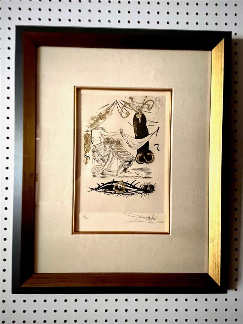 An EROTIC lithograph from Dali's Les Amours Jaunes 1974 suite; hand-signed, gold embellished # 118/300 in an classical frame with linen matts & plexi.25.5x21" framed.w/COA