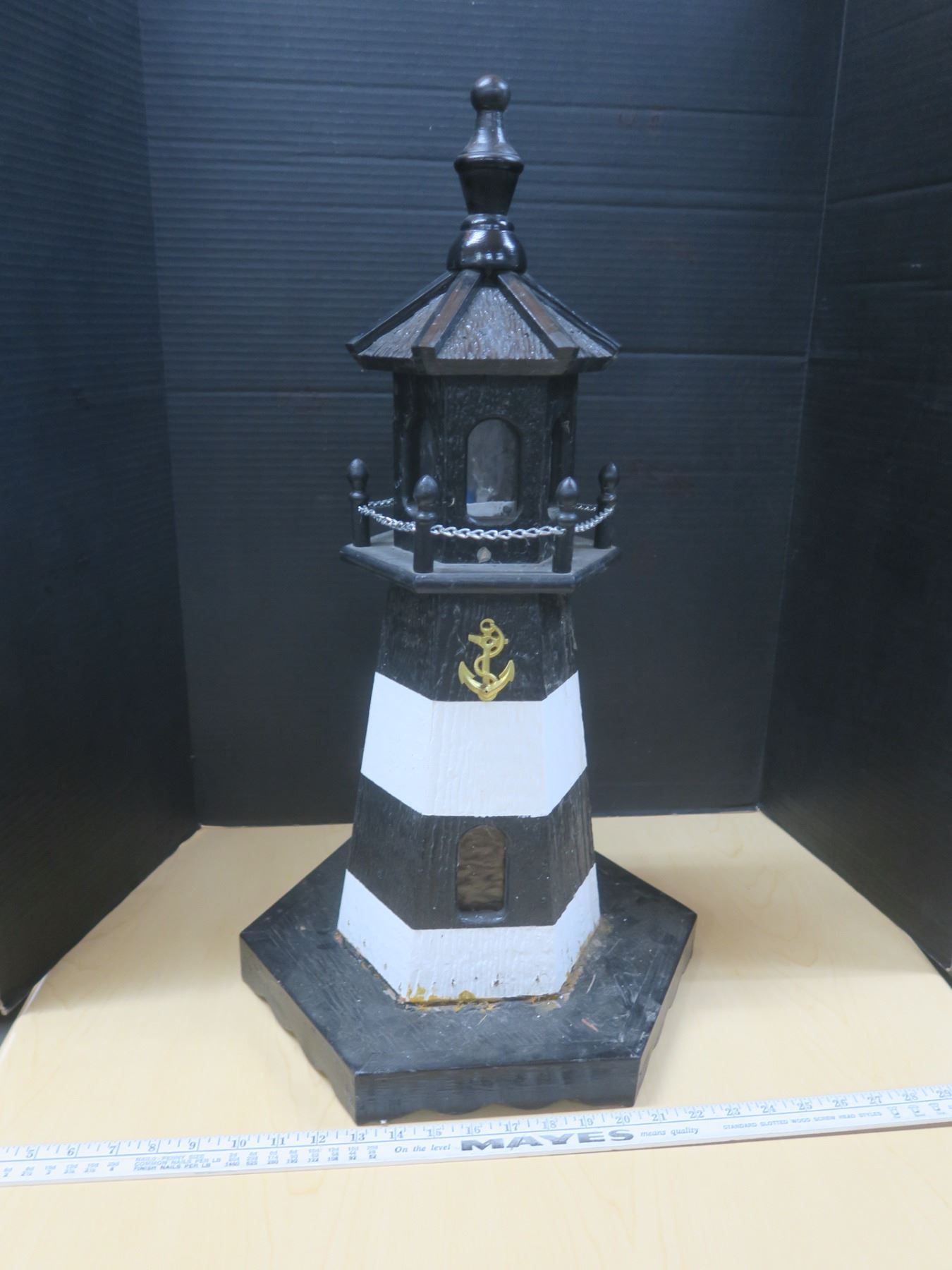 decorative wooden lighthouse - has light, needs new plug - 27" tall
