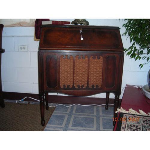 This is a walnut drop desk with radio. There is no radio inside, but there is space for speaker in the middle part with fabric and inside shelf for radio. We do have radio that can be placed in. It has a gloss finish.