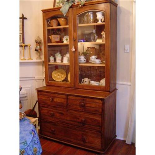 beautifull and original piece , bottom is achest of draws and the top is a display cabinet which could also be used as a book stand . pretty honey color pine . mint condition.