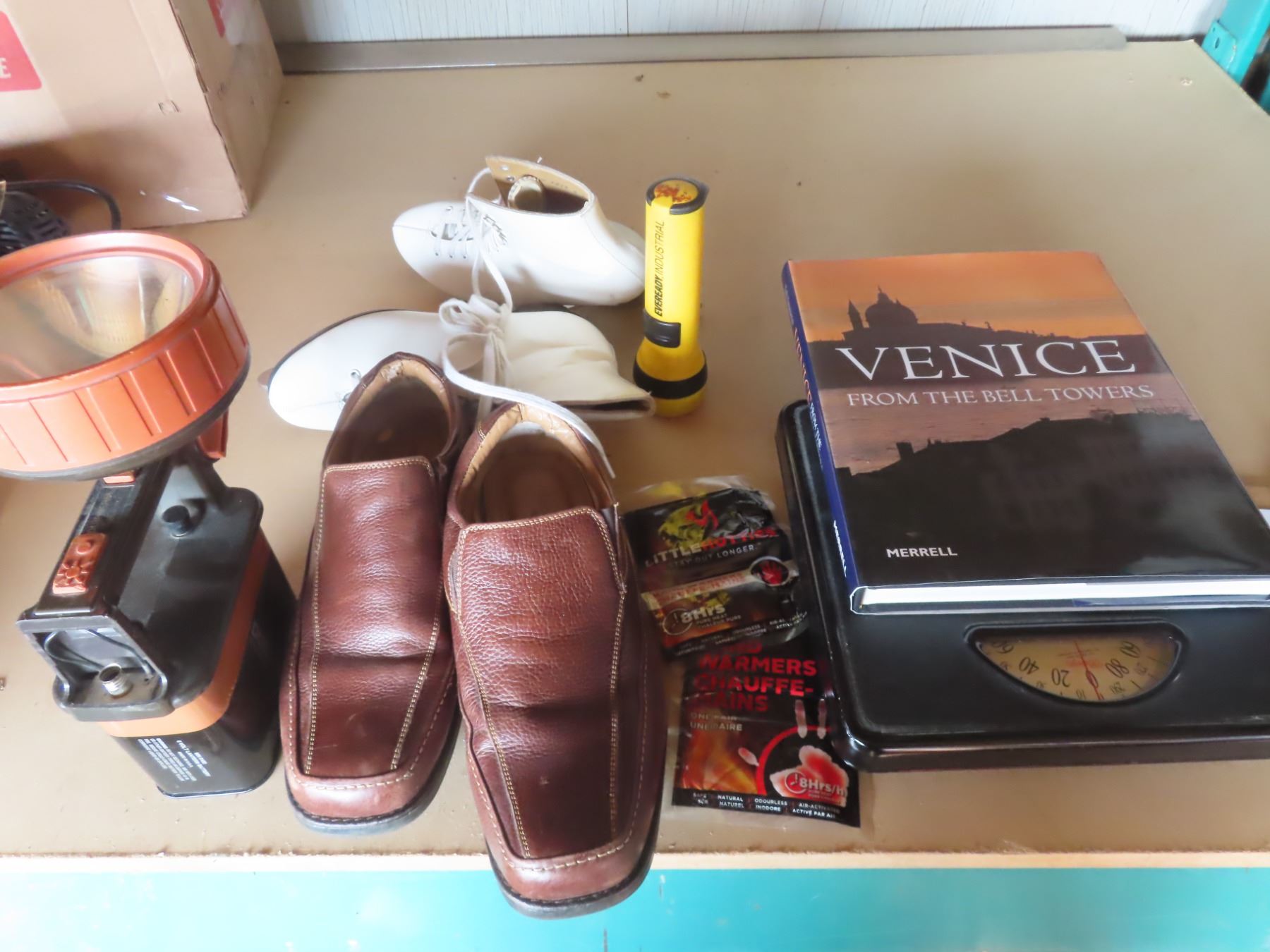 dockers mens size 11, size 9-2/3 figure skates, weight scale, flashlights