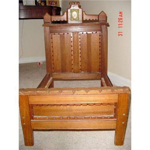 Victorian walnut doll bed. All orginial, carved footboard and headboard with painted oval decorative plaque. Very sweet!
