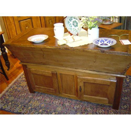 This fabulous french dough rising table would make a great center island. Its rich walnut color and grain are beautiful. The top lifts and can be used for storage as well as the lovely base that has two doors.