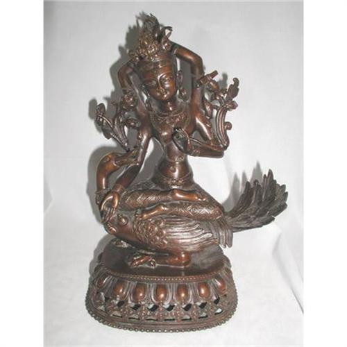 Very good early 20th c. Tibetan or sino-tibean bronze statue of a female deity with duck, sealled bottom in fine patina.
