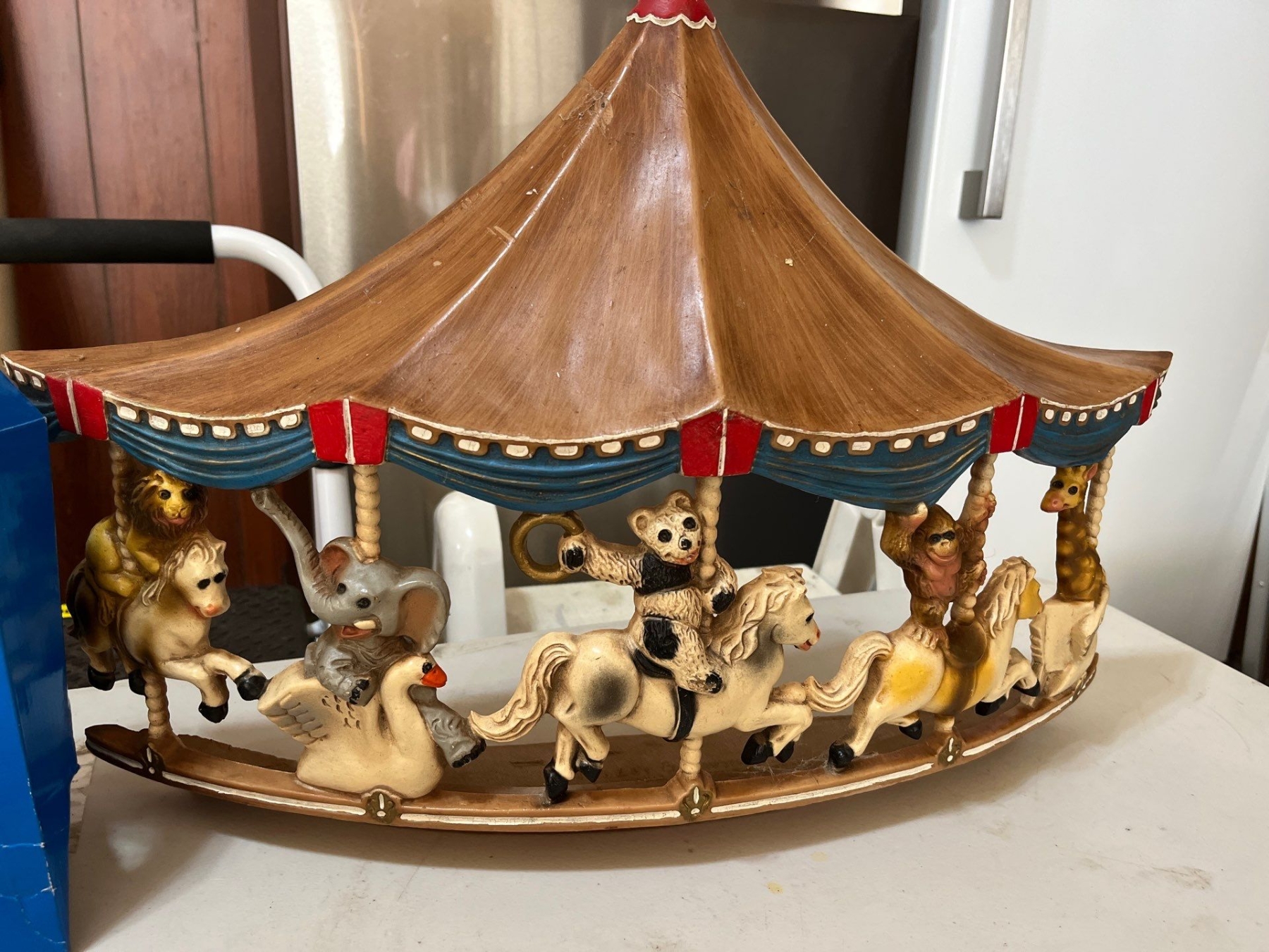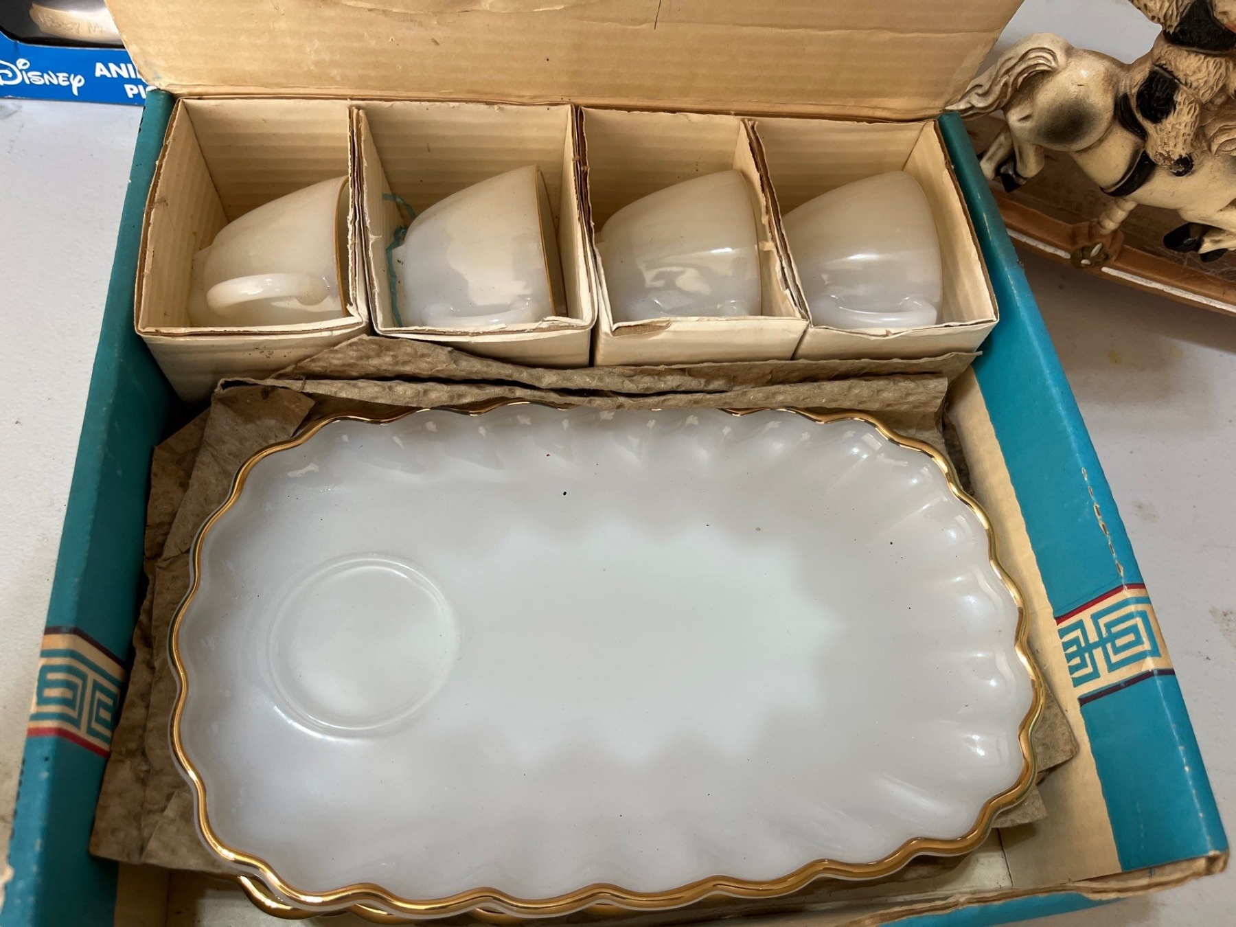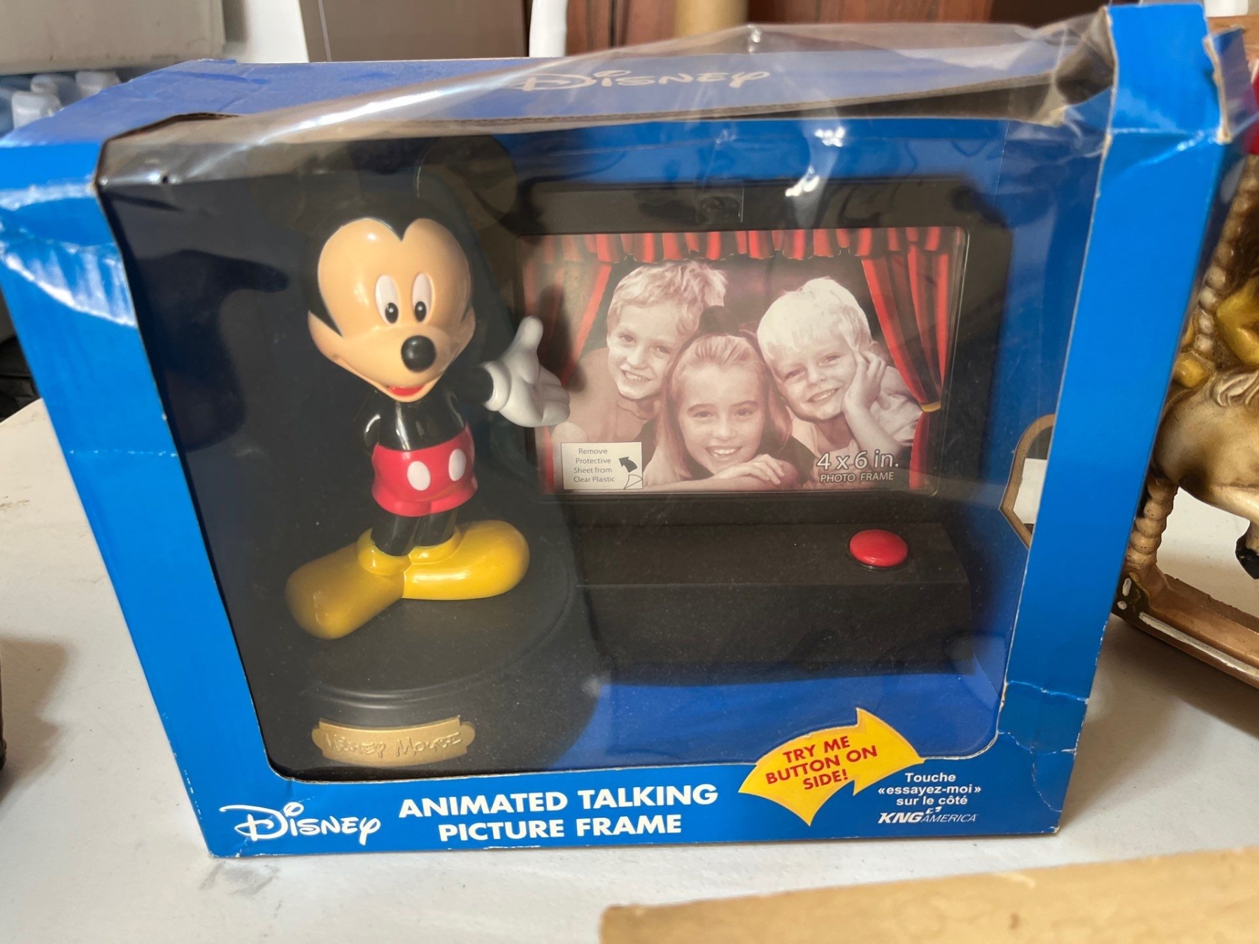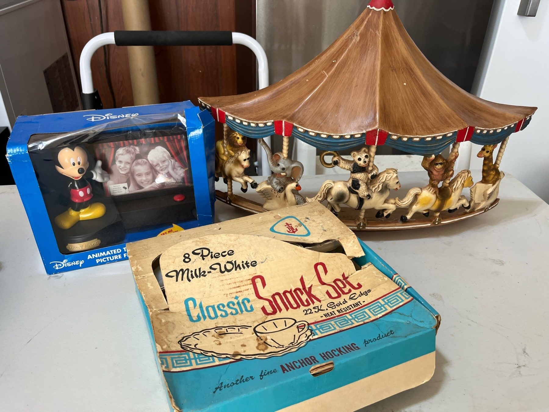 eight piece milk, white classic snack set in original box with Disney/Mickey Mouse picture frame and wall hanging Merry-go-round