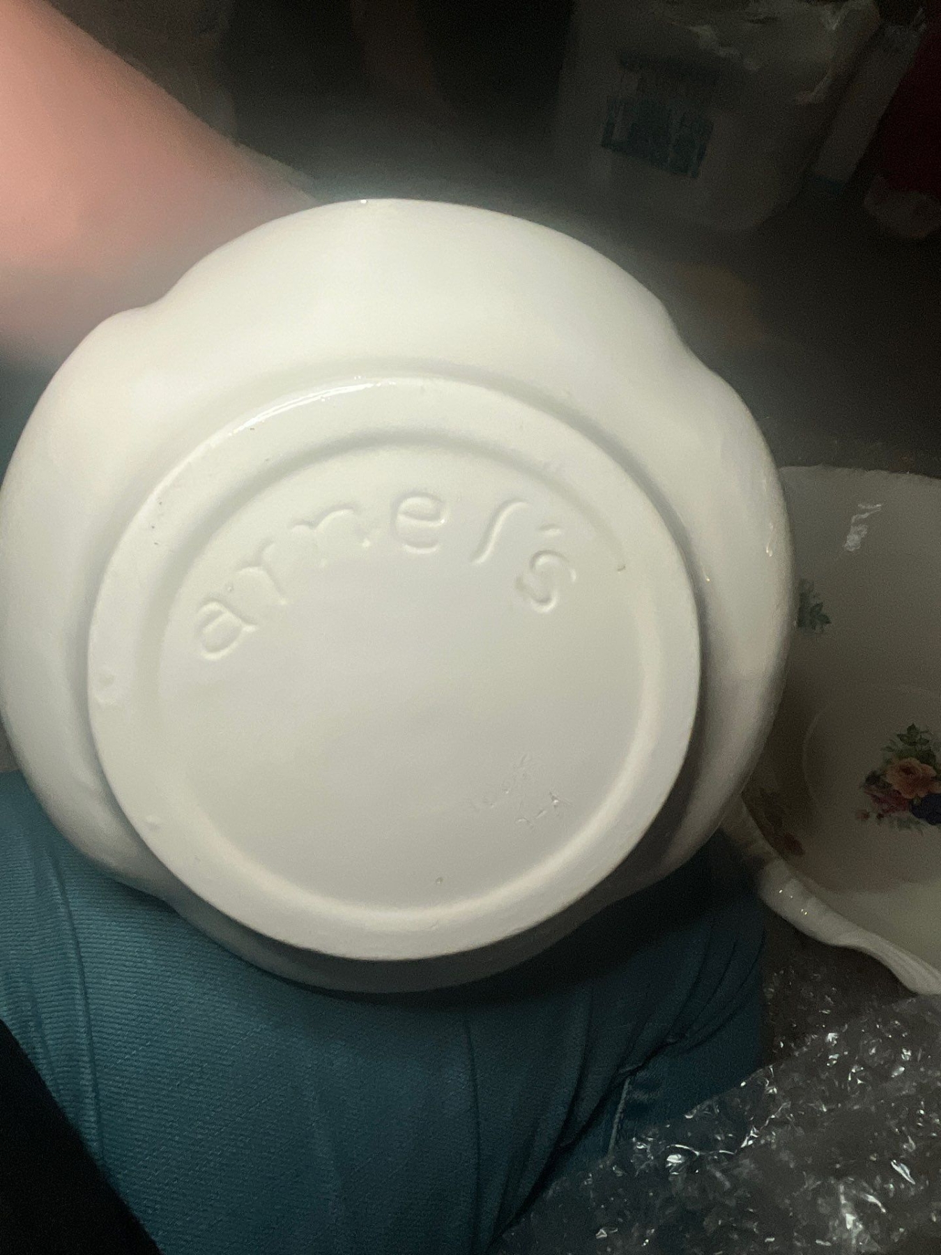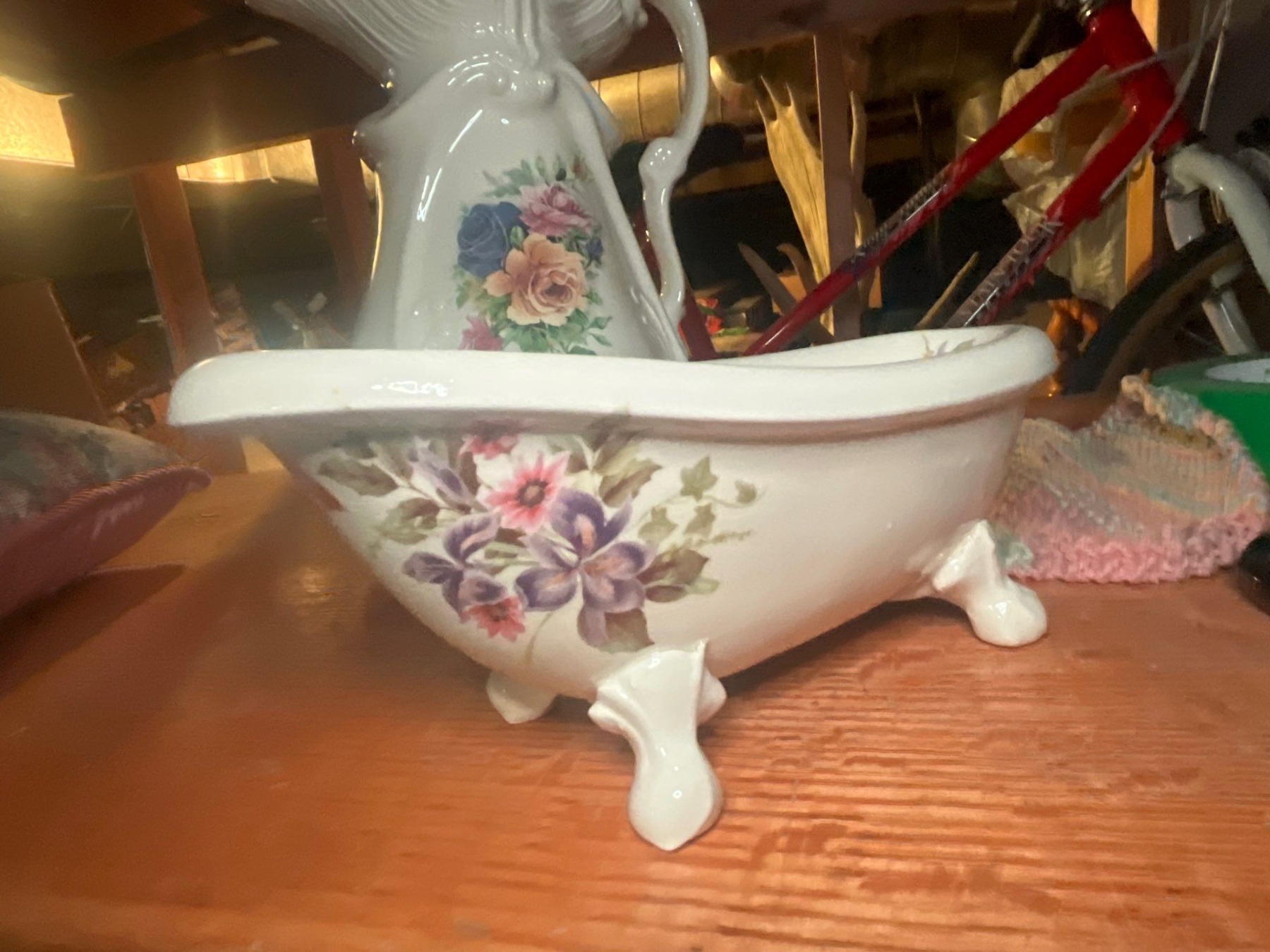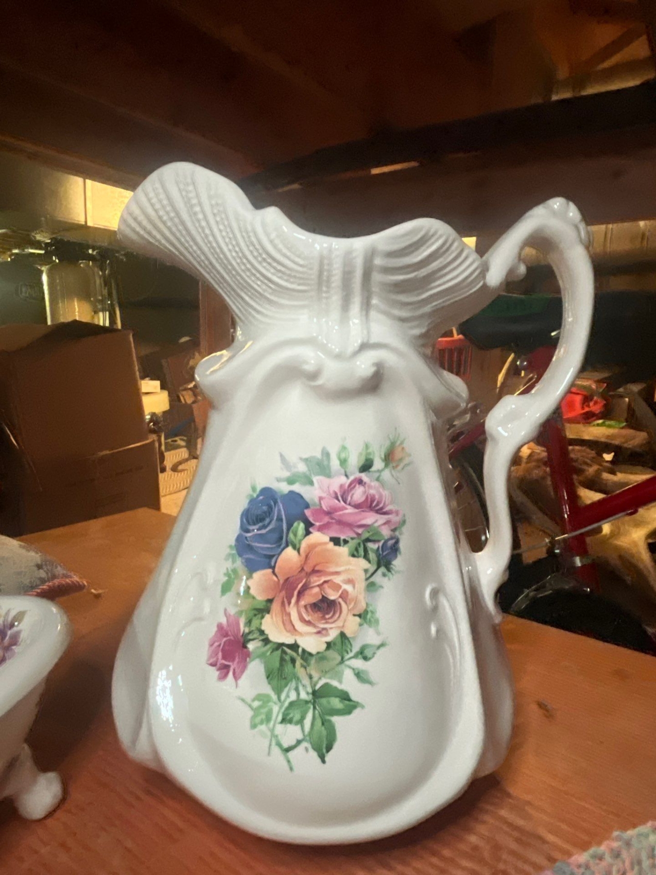 elegant water, basin and pitcher from MLS along with small pottery top with flowers and new white crisp never been used tablecloth.