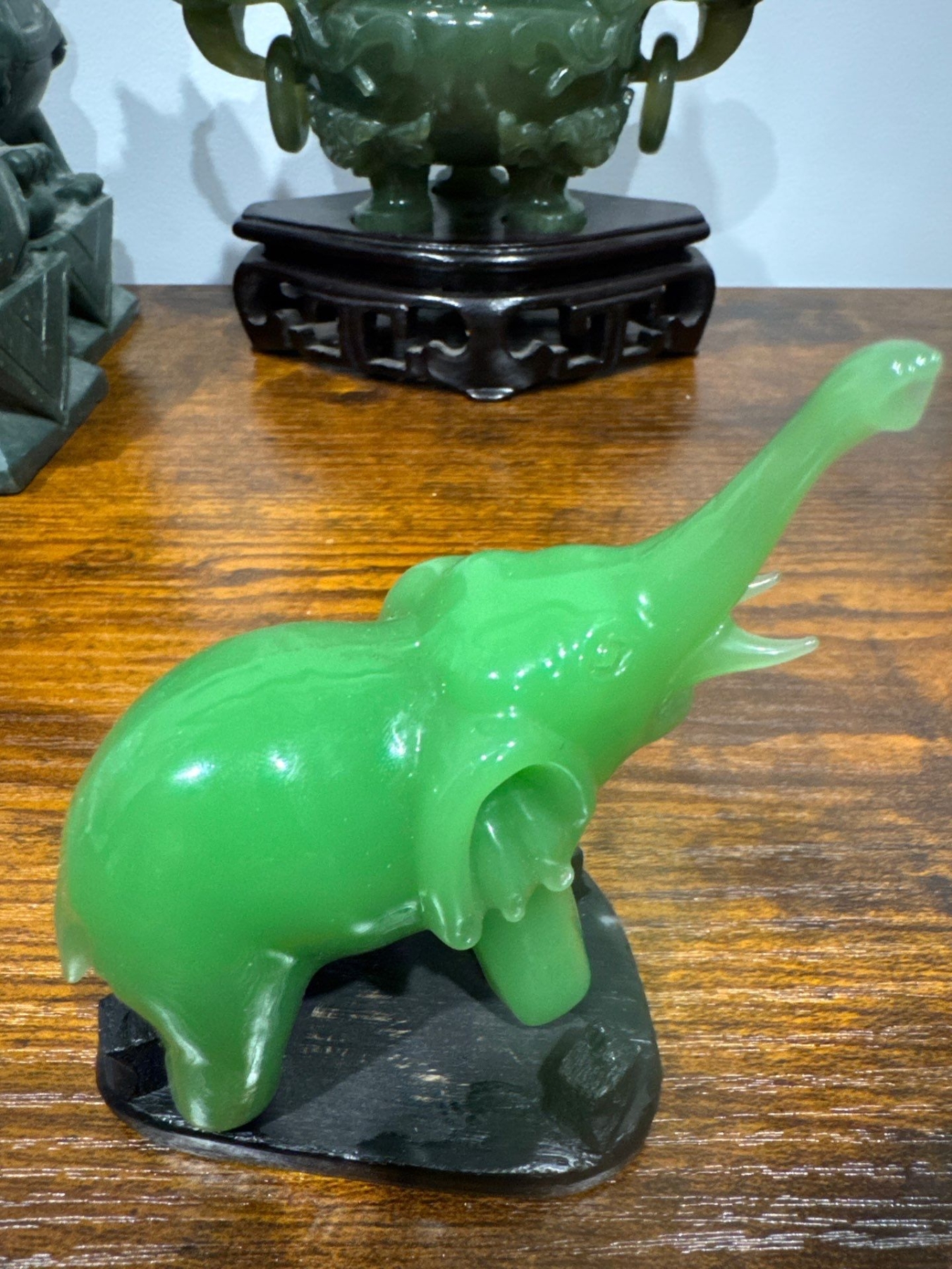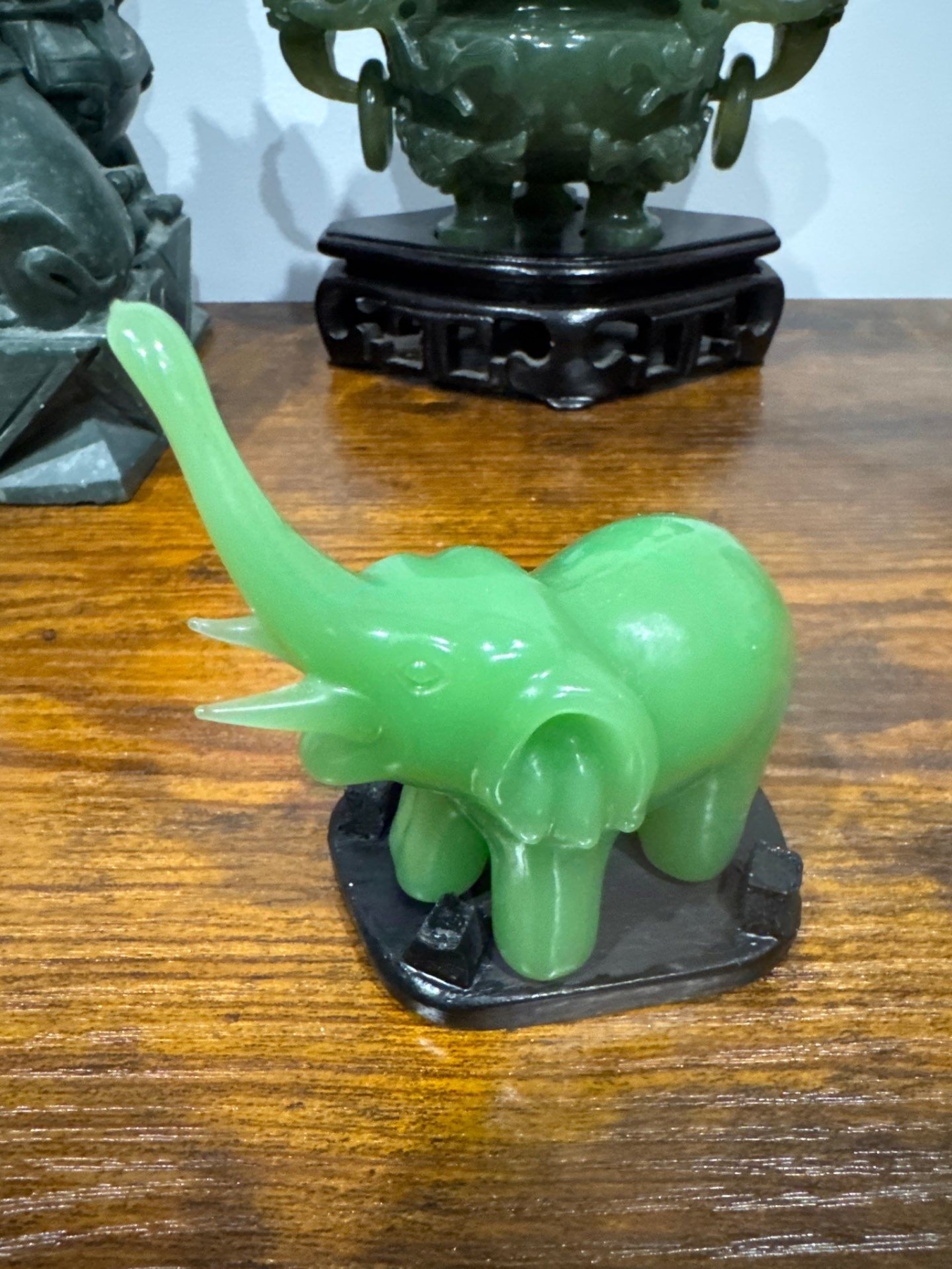 vintage green jade elephant with its trunk raised.
