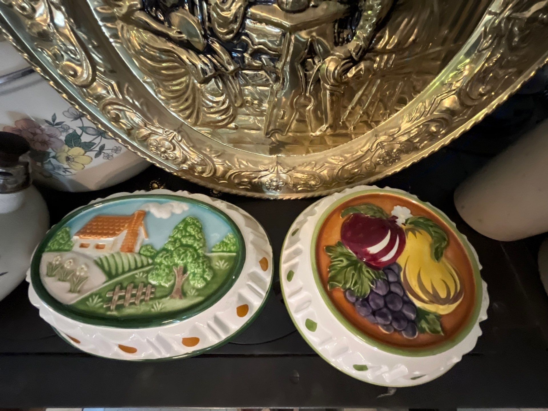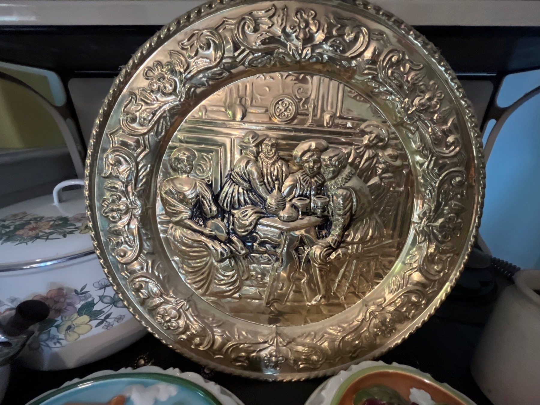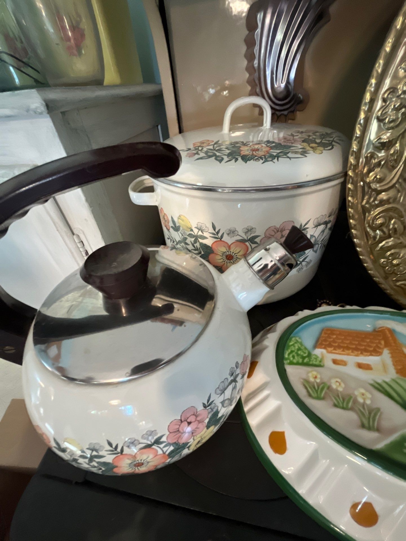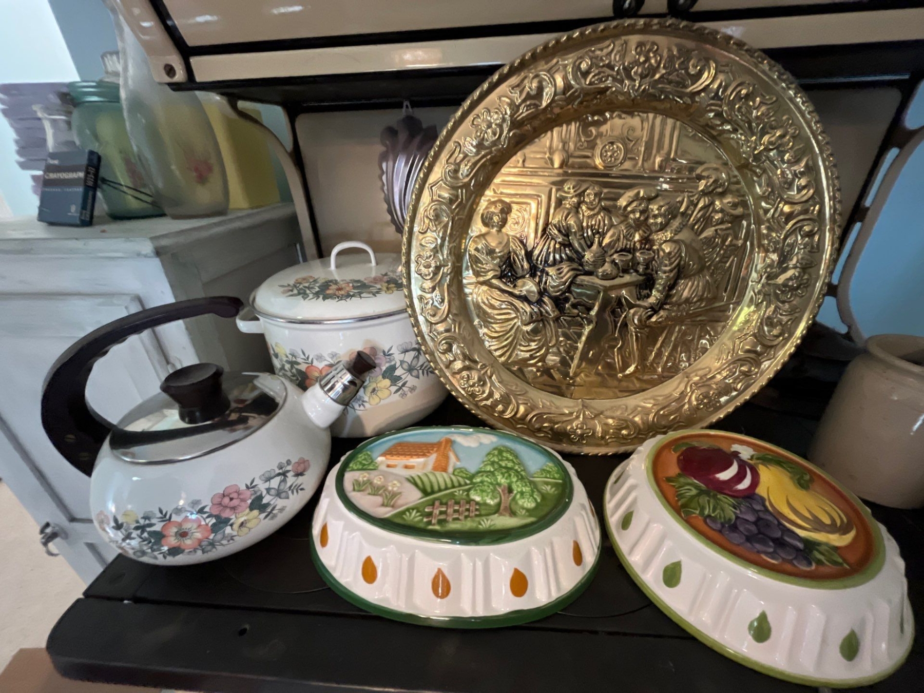 enamel canning pot with matching tea pot and two ceramic wall hangers with vintage copper wall hanging plate