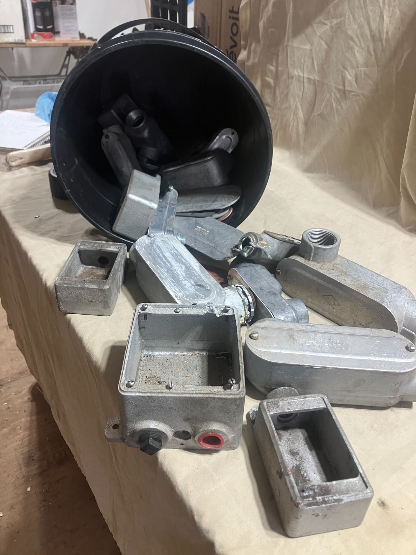 Bucket of misc. explosion-proof receptacle boxes and LB fittings