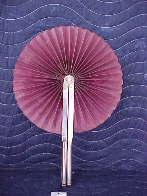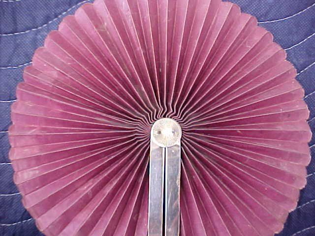 fan #18. popular 1880-1920 Cockade fan. cream colored oil cloth fan with covered handles resembles wood. excellent condition. these were popular in the late 19th century to about 1910-20